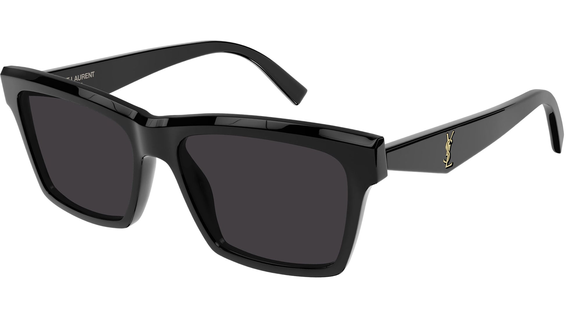 Saint Laurent Monogram sunglasses model SL M104 rectangle acetate frame color code 004 shiny black with black temple and polar solid grey lens.