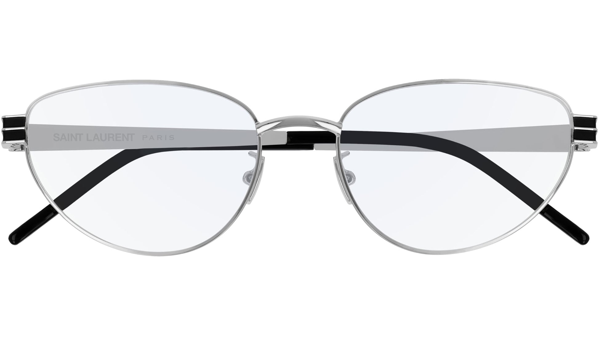 Saint Laurent SL M52 002 glasses for women, featuring shiny silver cat eye metal frame and demo lenses. Brand line: Monogram. Style code: SL M52. Color code: 002. Made in Italy. Authorized Saint Laurent online reseller. Your glasses will include the original case and accessories and are covered by a 12-month global warranty.