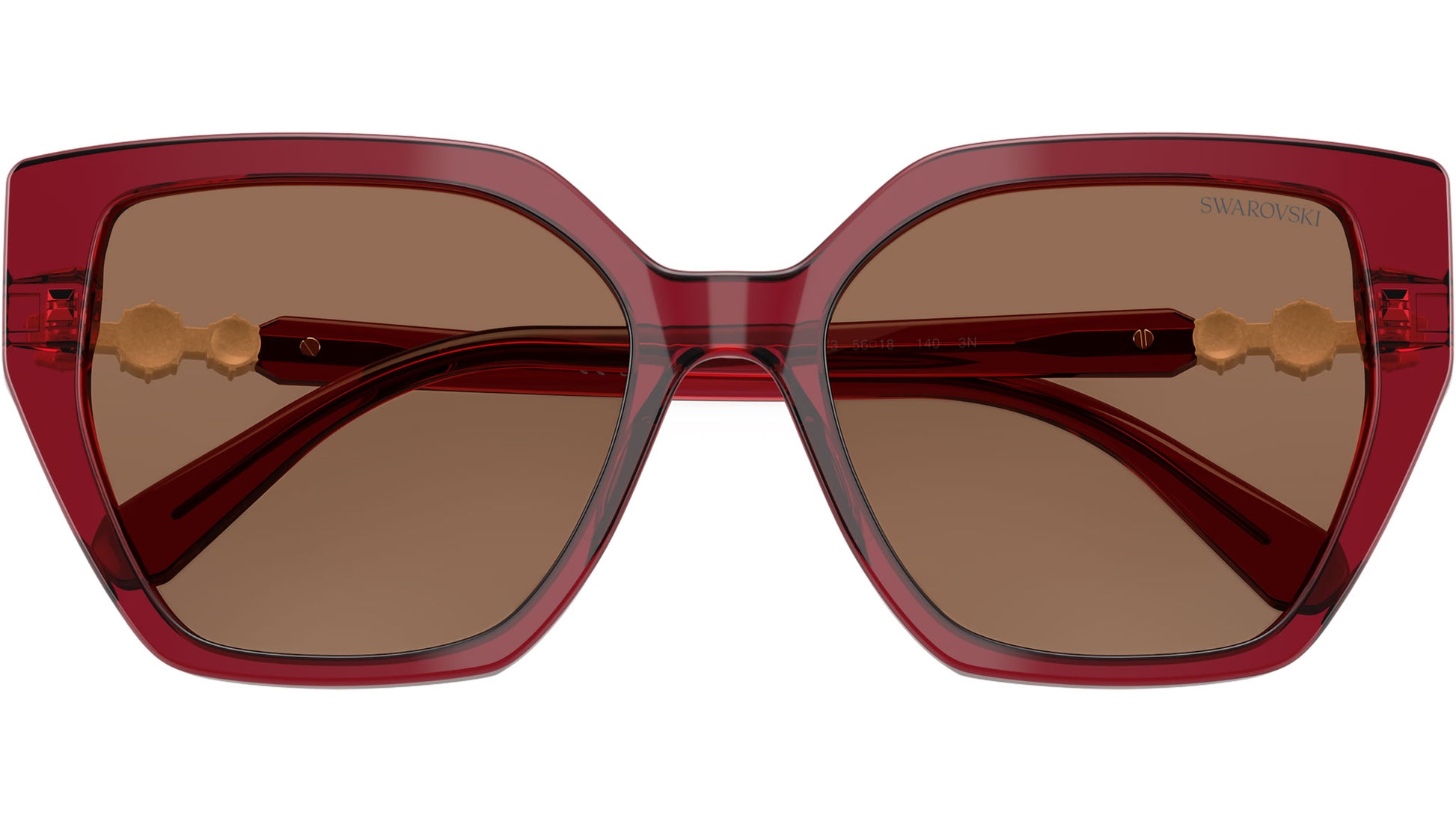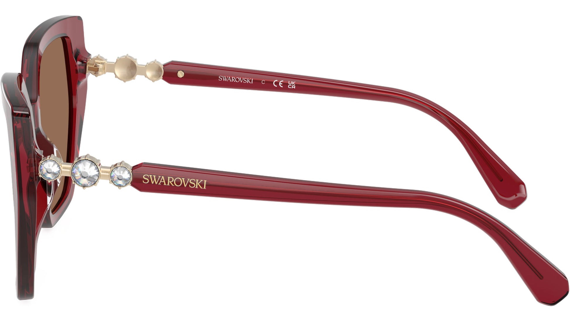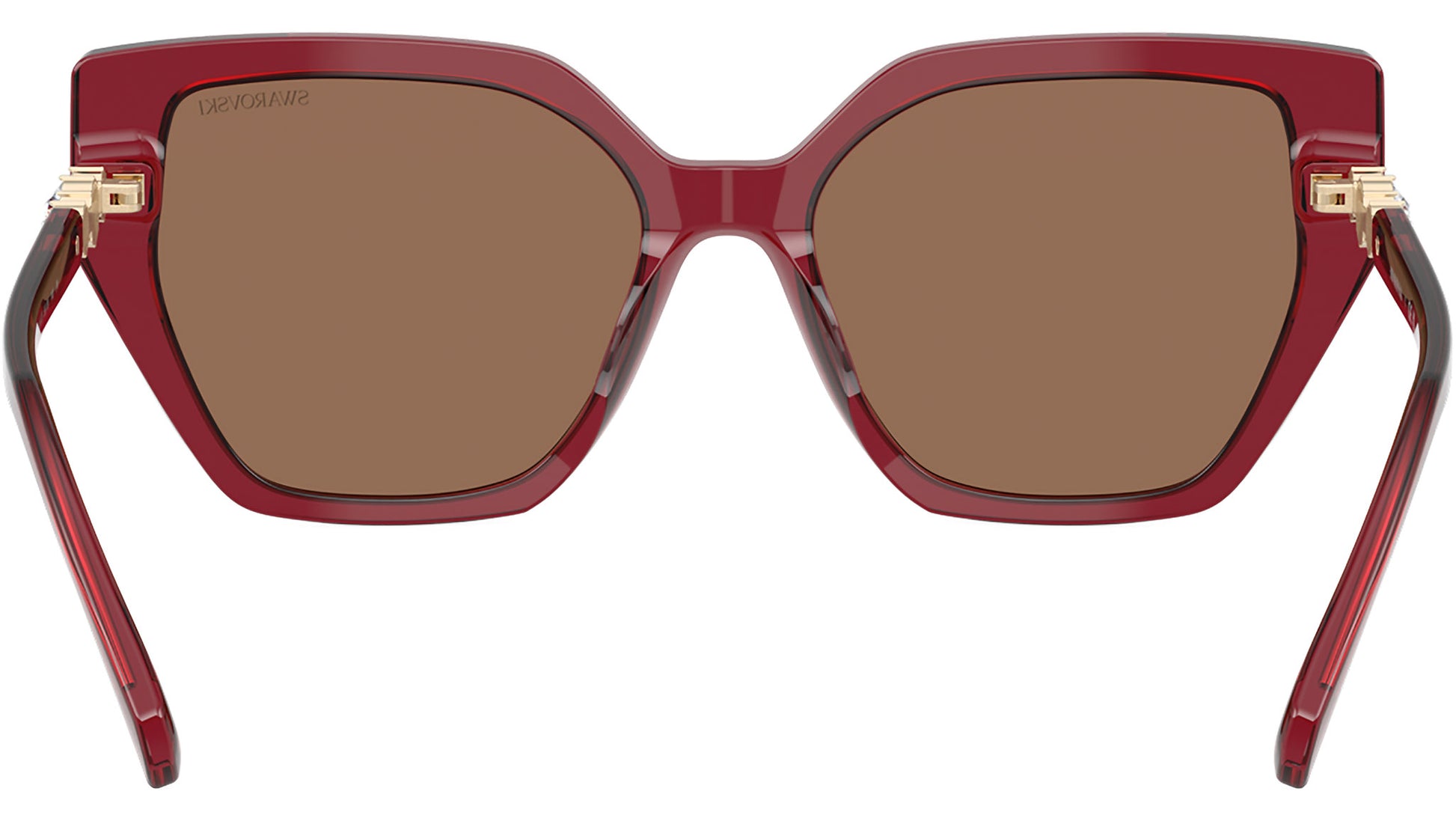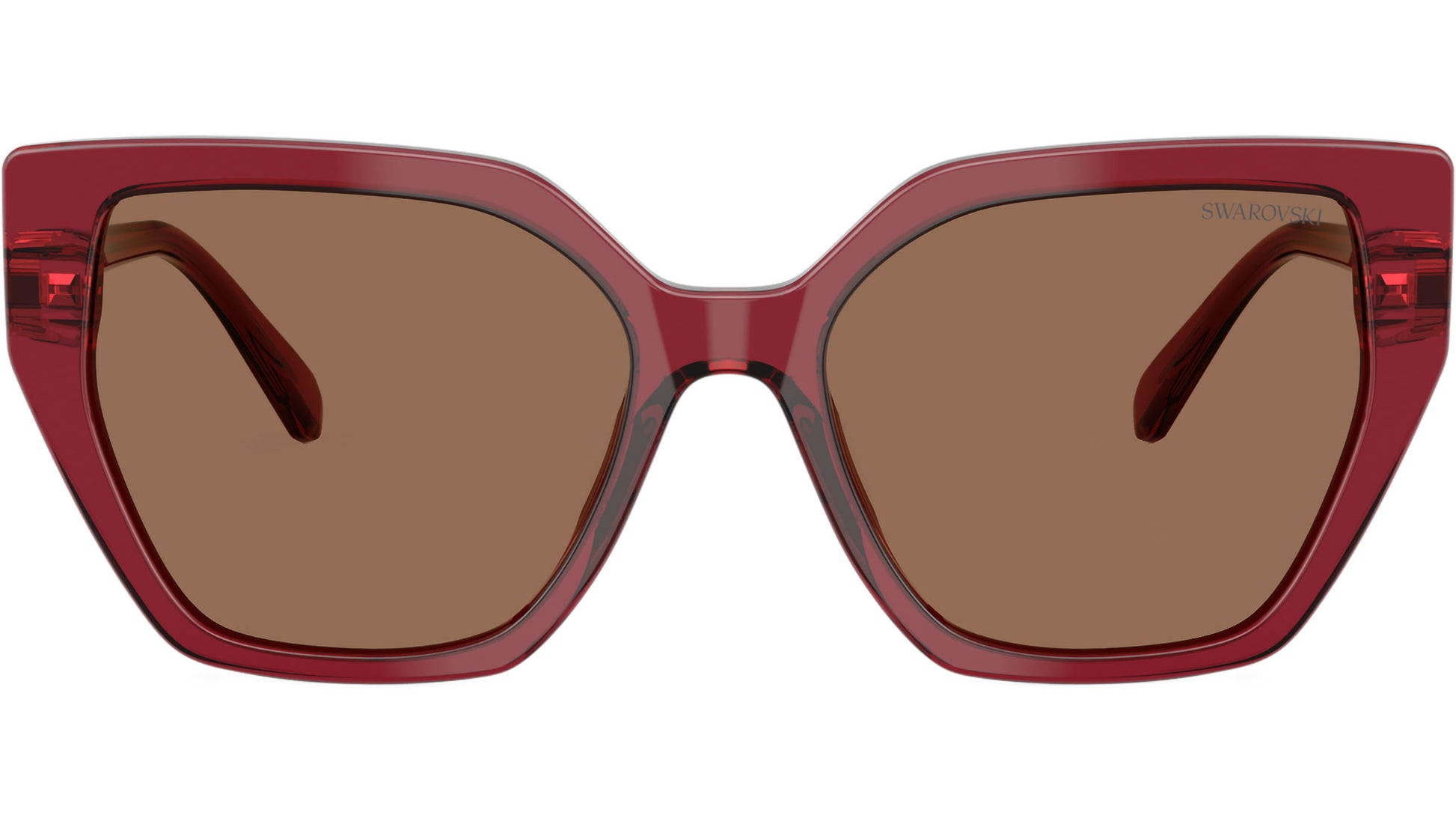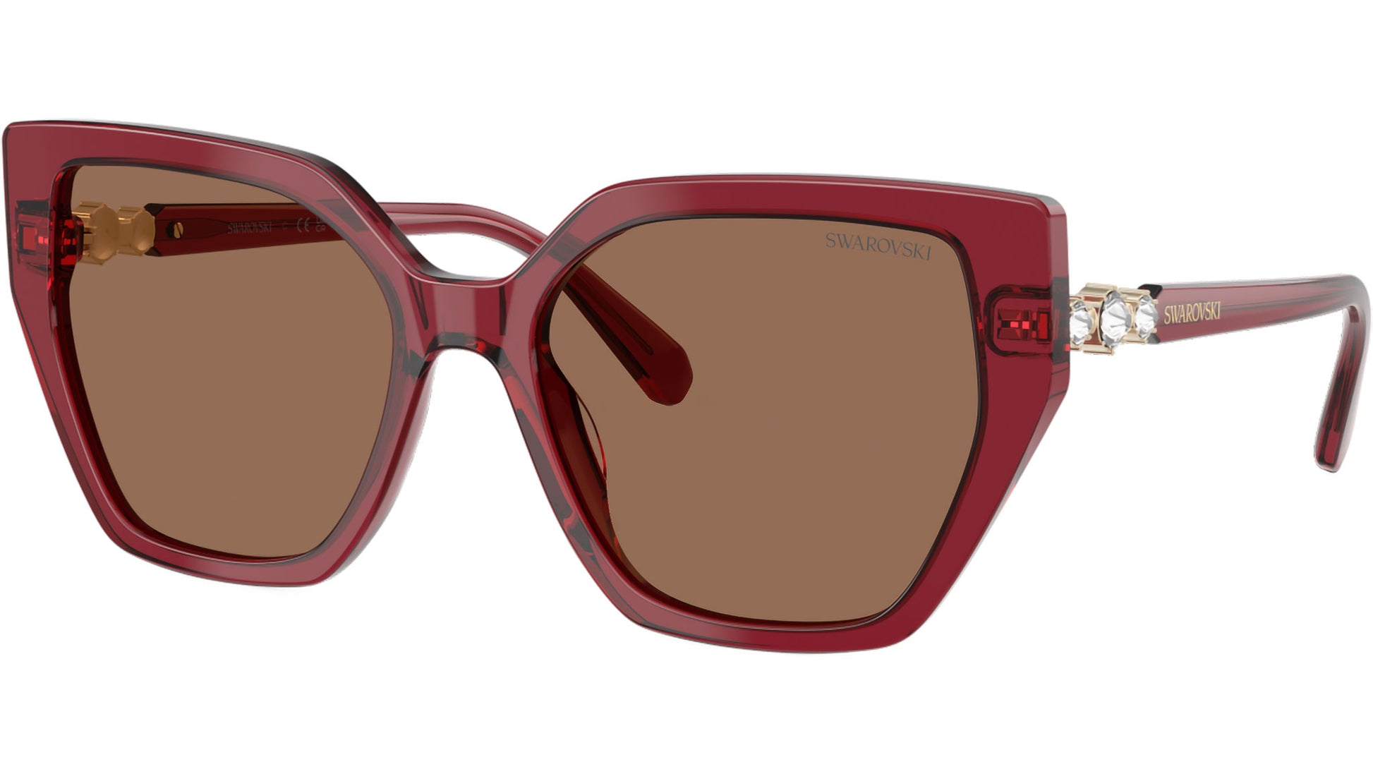 Swarovski sunglasses for women model 6016 featuring transparent burgundy full rim acetate frame and base 4 dark brown lenses. High bridge fit. Frame line: Science of Elegance. Brand code: 0SK6016. Color code: 105573. Authorised Swarovski Eyewear Online Reseller. Your glasses will come including the original case and accessories and will be covered by 12 month global warranty.