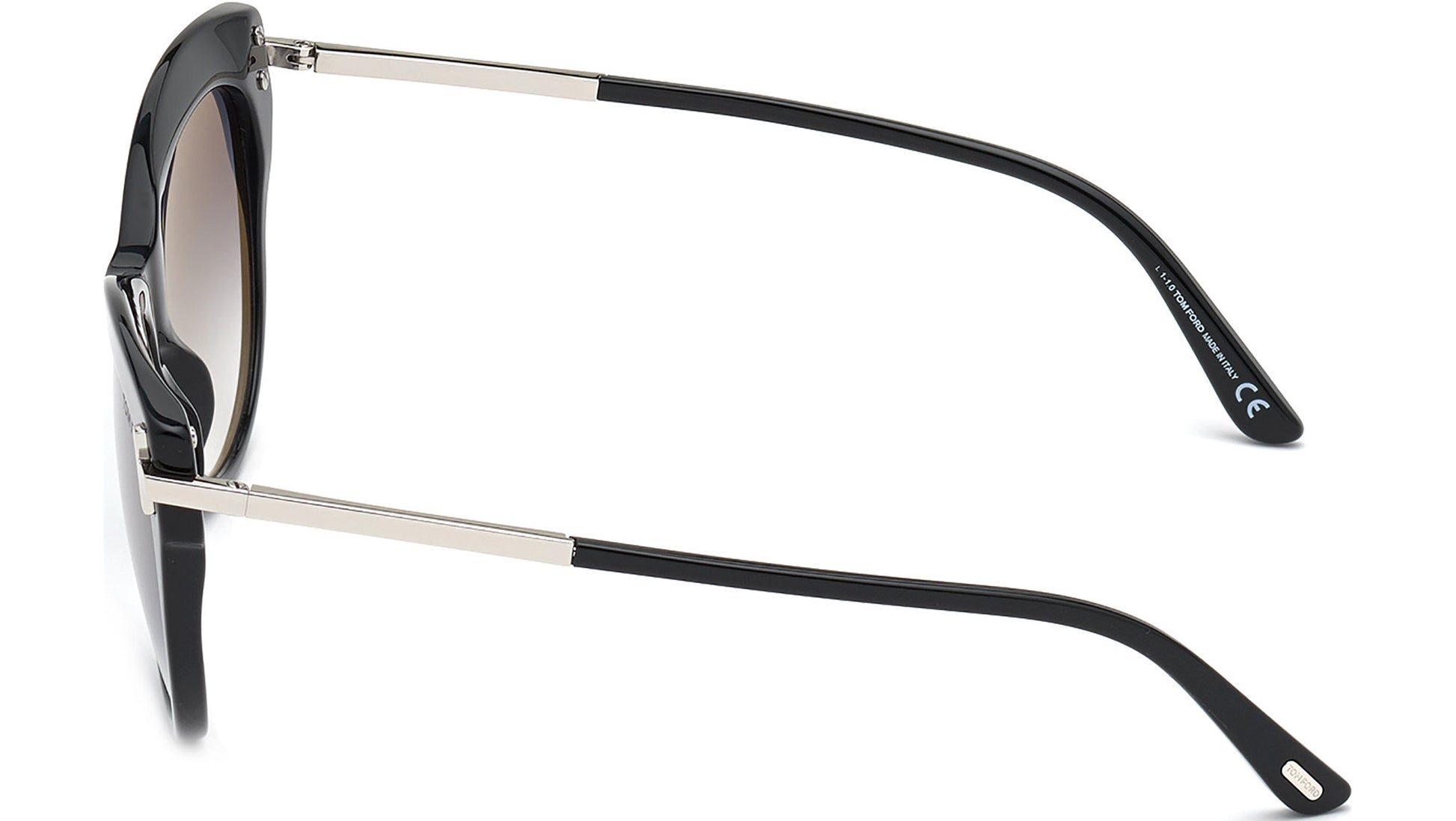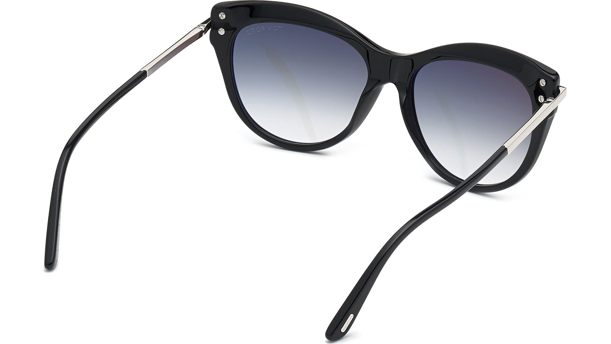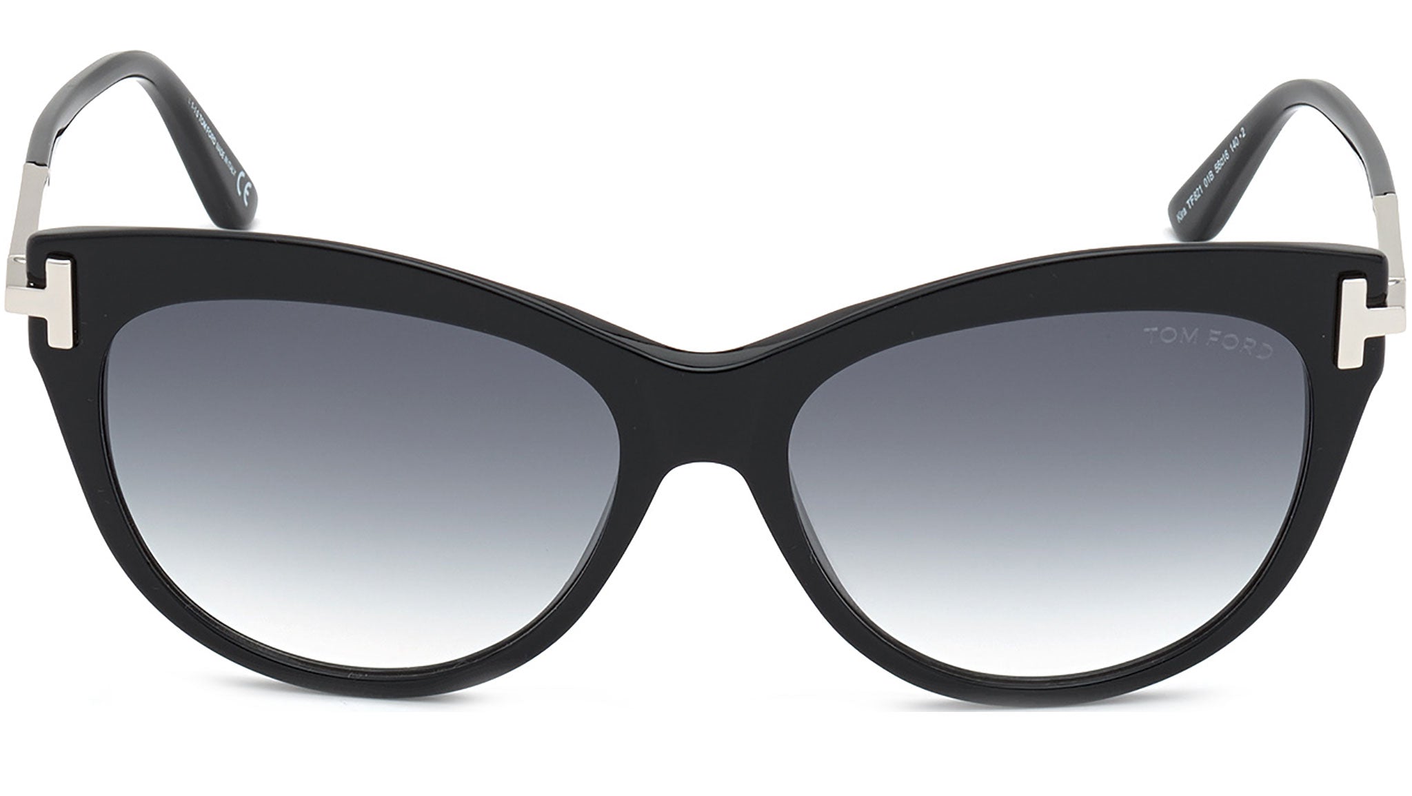 Tom Ford Kira sunglasses model FT0821 01B featuring shiny black frame and gradient grey lens.