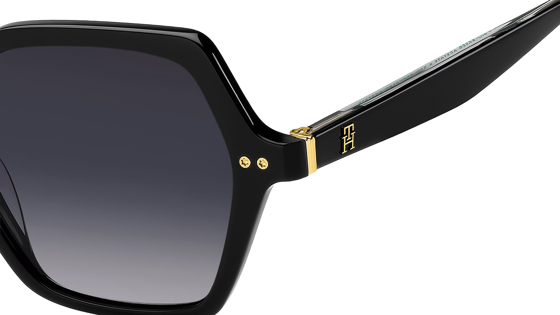 Tommy Hilfiger TH 2213/S 807 9O sunglasses featuring black butterfly eco acetate frame and dark grey shaded lenses. Sunglasses in the Tommy Hilfiger collection are the expression of modern and versatile yet preppy style, designed for young women who seek a timeless look. The front comes in on-trend shapes, brightened by double rivets and compatible with prescription lenses. The iconic raised TH monogram on the temples enriches the style with a feminine twist. The structure is more sustainable, made from renewed acetate. These glasses come in a range of colours in different shapes. Brand line: Modern Preppy. Style code: 207945. Color code: 807 9O. Authorized Tommy Hilfiger online reseller. Your glasses will include the original case and accessories and are covered by a 12-month global warranty.