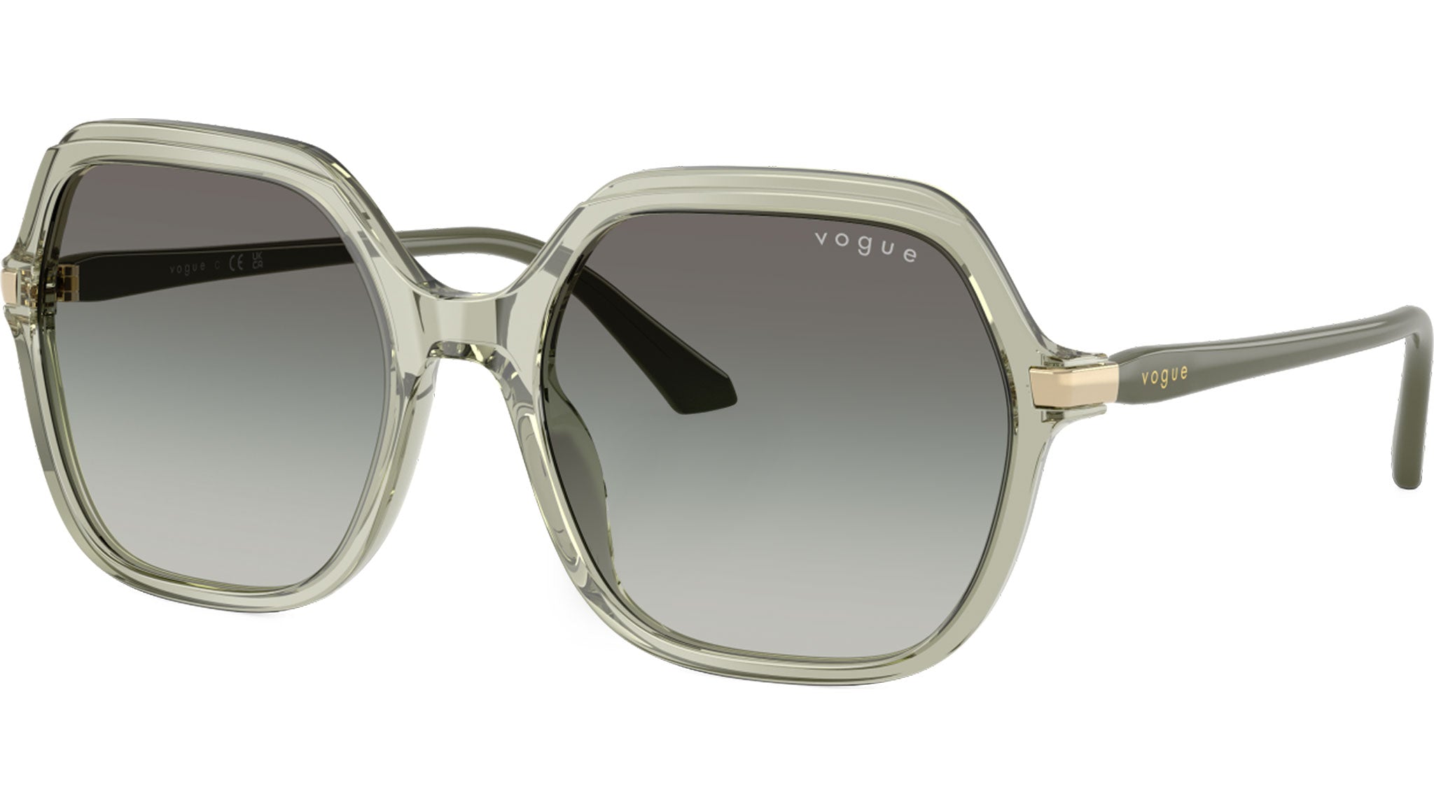 Vogue sunglasses for women model VO5561S 302211 featuring transparent green acetate frame and gradient grey base 4 bio poliammide lenses. High bridge fit. Frame line: In Vogue. Brand code: 0VO5561S. Color code: 302211. Authorised Vogue Eyewear Online Reseller. Your glasses will come including the original case and accessories and will be covered by 12 month global warranty.