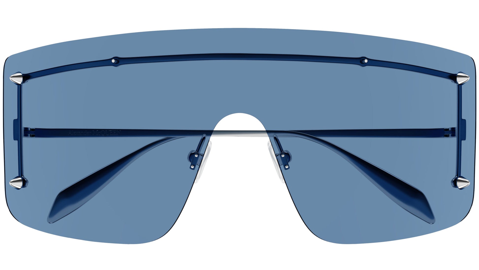 Alexander McQueen Icons collection sunglasses model AM0412S color code 004 featuring shiny silver frame and solid light blue cylindrical mask lens.