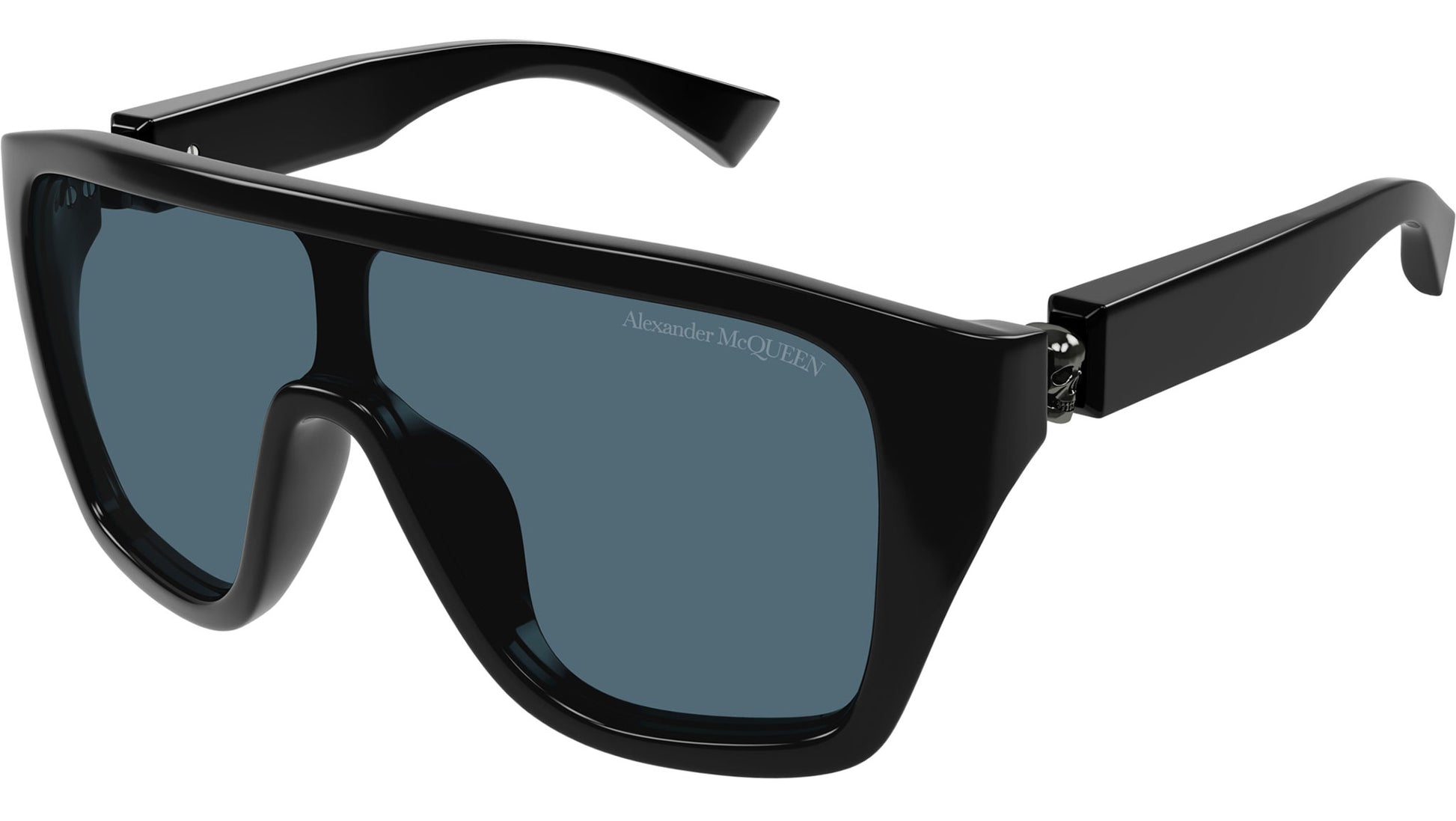Alexander McQueen Icons sunglasses model AM0430S shield recycled acetate frame color code 004 shiny solid black with black temple and solid teal mask lens.