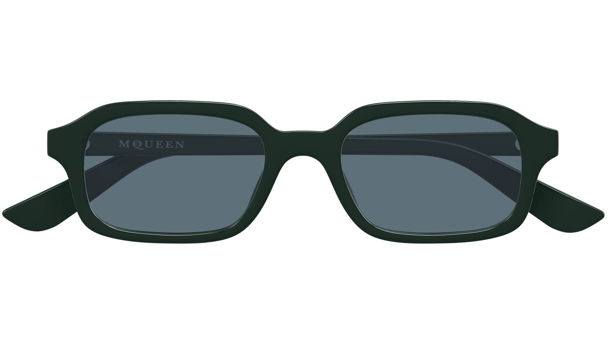 Alexander McQueen AM0558S 004 sunglasses for men, featuring shiny dark green rectangular recycled acetate frame and solid light blue bio nylon lenses. Brand line: Logo. Style code: AM0558S. Color code: 004. Made in Italy. Authorized Alexander McQueen online reseller. Your glasses will include the original case and accessories and are covered by a 12-month global warranty.