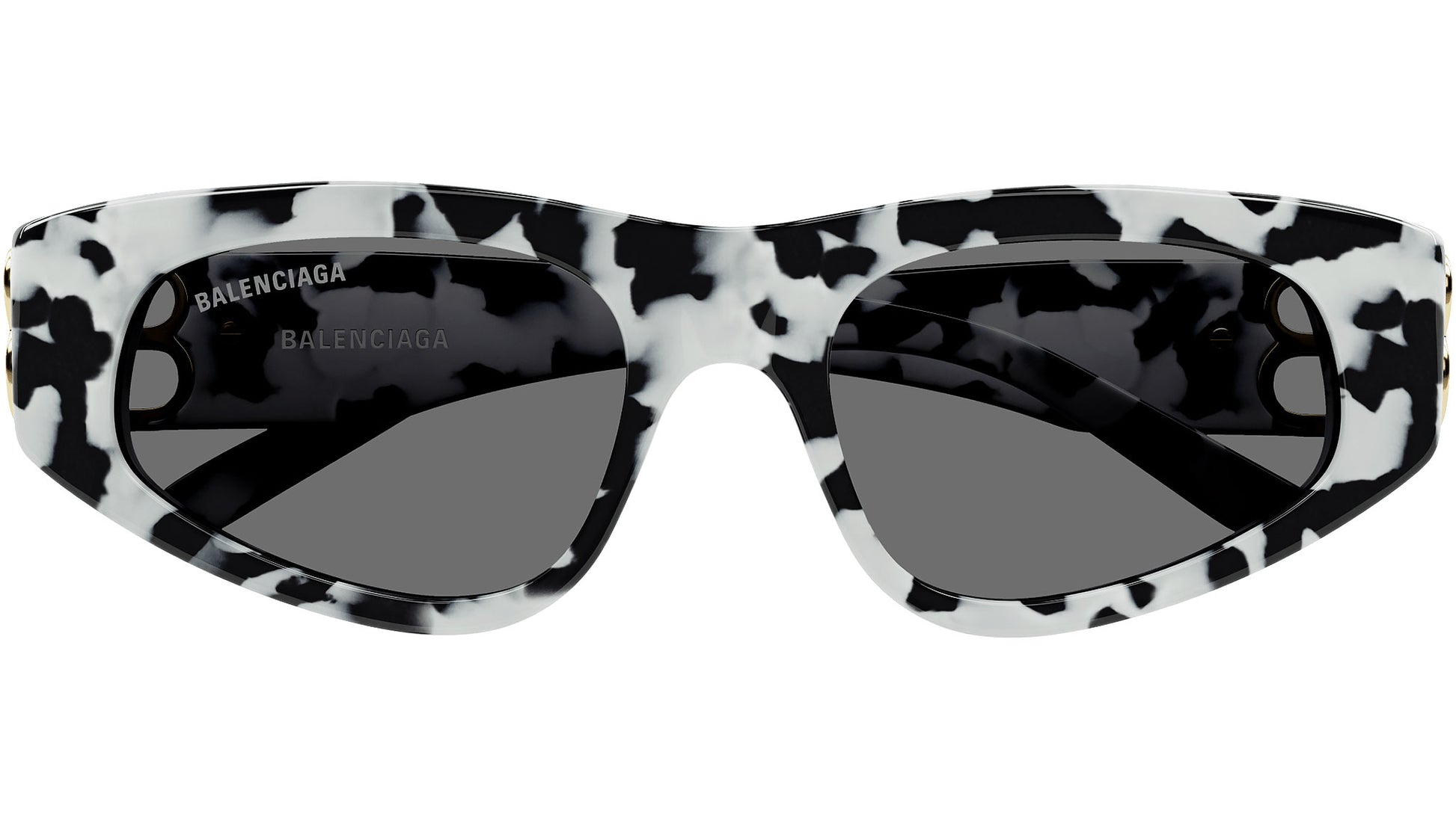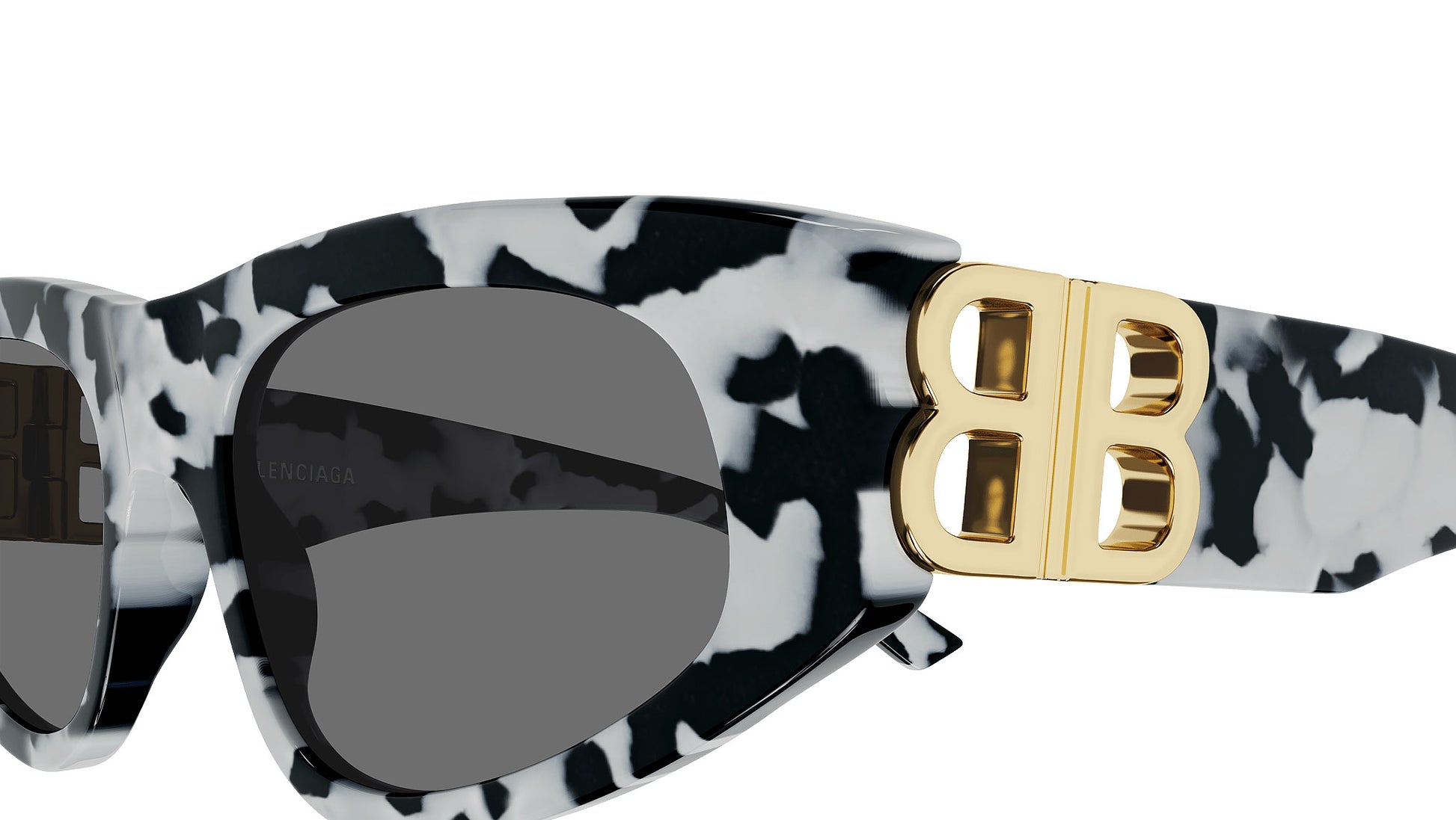Balenciaga Everyday collection sunglasses model BB0095S 010 featuring shiny black and white havana frame and solid grey lens.