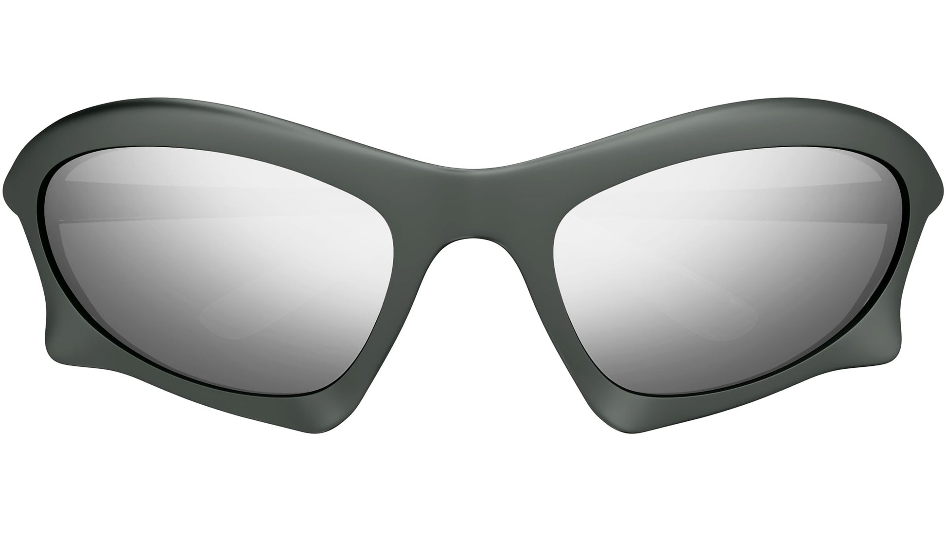 Balenciaga Extreme collection sunglasses model BB0229S 002 featuring matte solid metallic dark ruthenium frame and solid grey + ml silver lens.