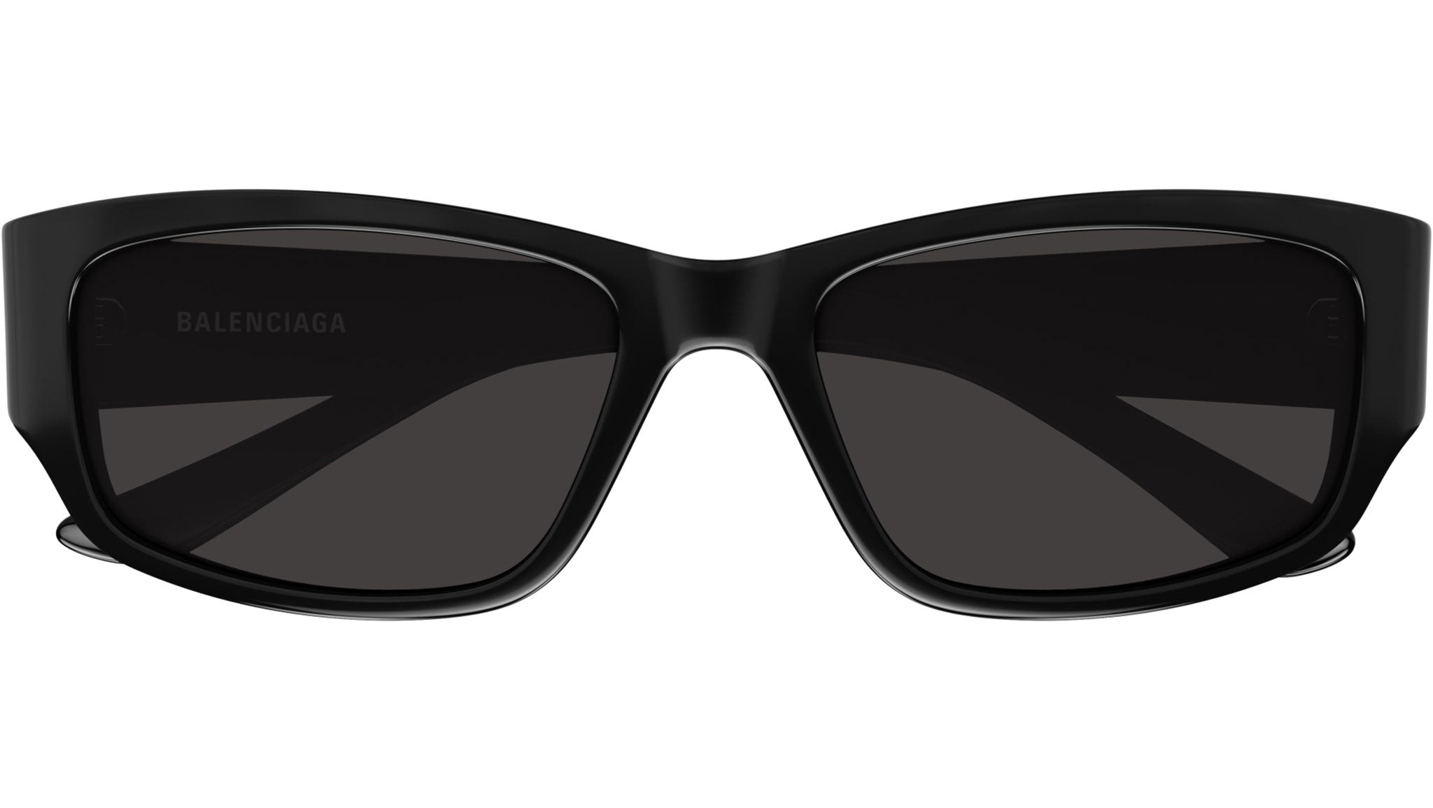 Balenciaga sunglasses model BB0368SK from Everyday eyewear line, color code 001 shiny solid black recycled acetate, rectangle frame shape with solid grey lens.