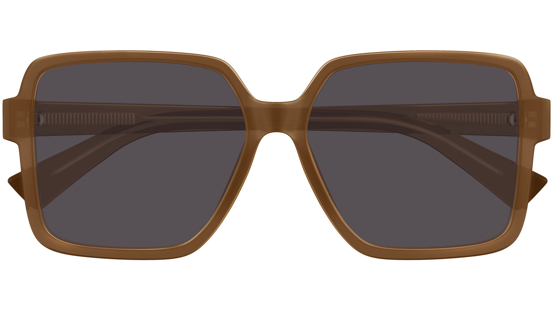 Bottega Veneta sunglasses model BV1317SK rectangle recycled acetate frame color code 004 shiny transparent brown with brown temple and solid grey lenses. Authorized Bottega Veneta online reseller. Your glasses will come with the original case and accessories and will be covered by a 12-month global warranty.