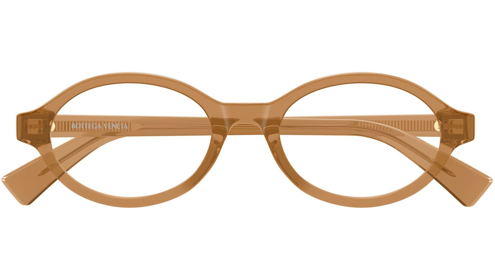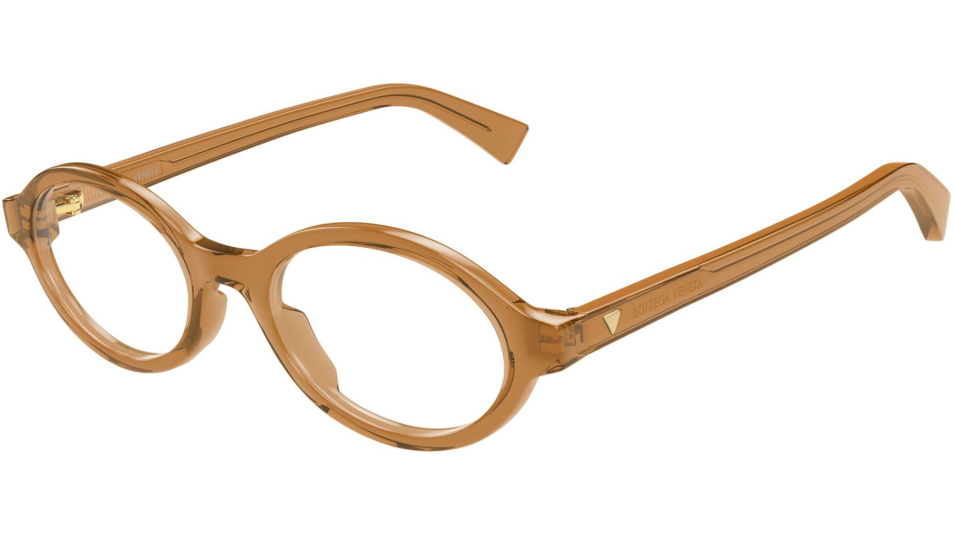 Bottega Veneta BV1367O 005 glasses for women, featuring shiny transparent dusty orange panthos recycled acetate frame and demo lenses. Brand line: Triangle. Style code: BV1367O. Color code: 005. Made in Italy. Authorized Bottega Veneta online reseller. Your glasses will include the original case and accessories and are covered by a 12-month global warranty.