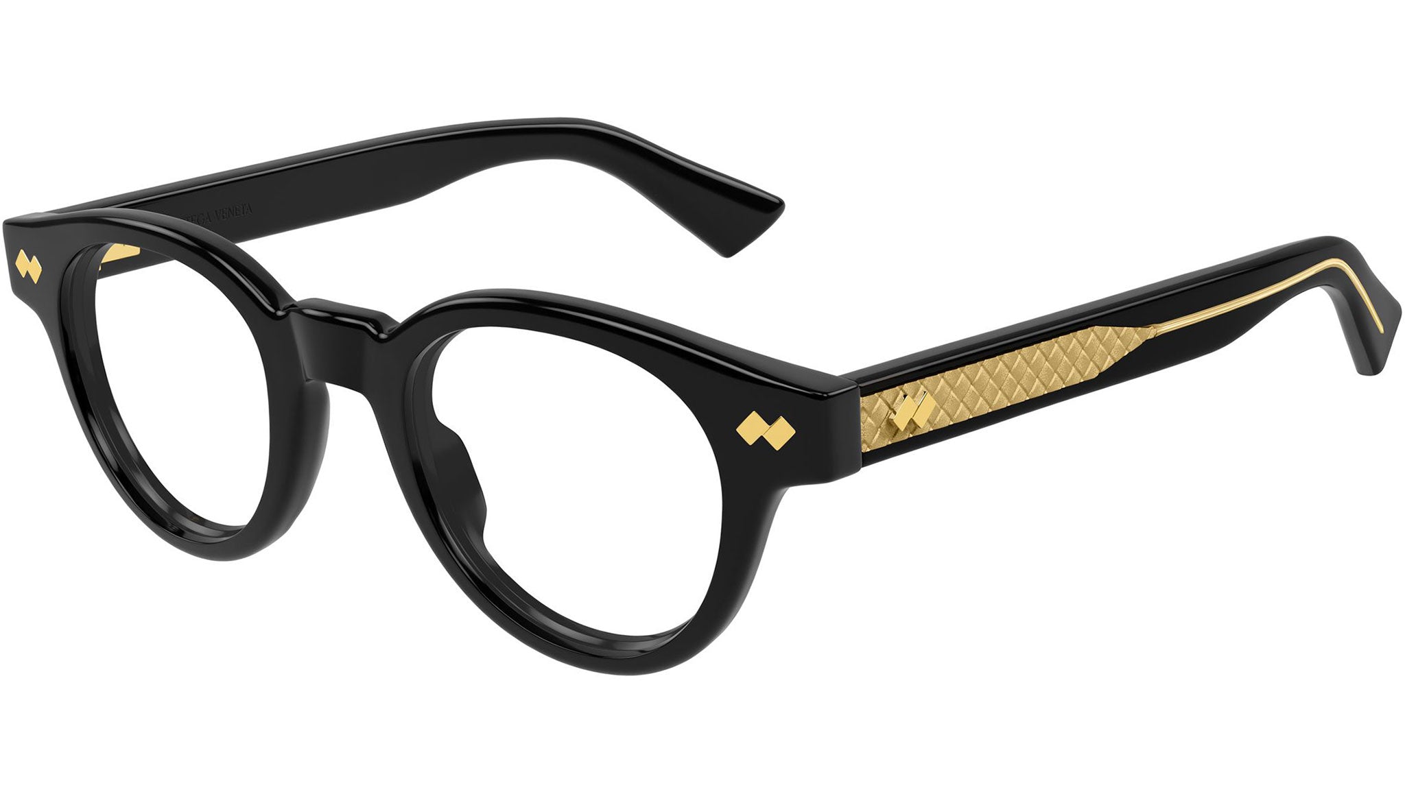 Bottega Veneta BV1443O 001 glasses for men and woman, featuring shiny solid black panthos recycled acetate frame and demo lenses. Brand line: Intrecciato. Style code: BV1443O. Color code: 001. Made in Japan. Authorized Bottega Veneta online reseller. Your glasses will include the original case and accessories and are covered by a 12-month global warranty.