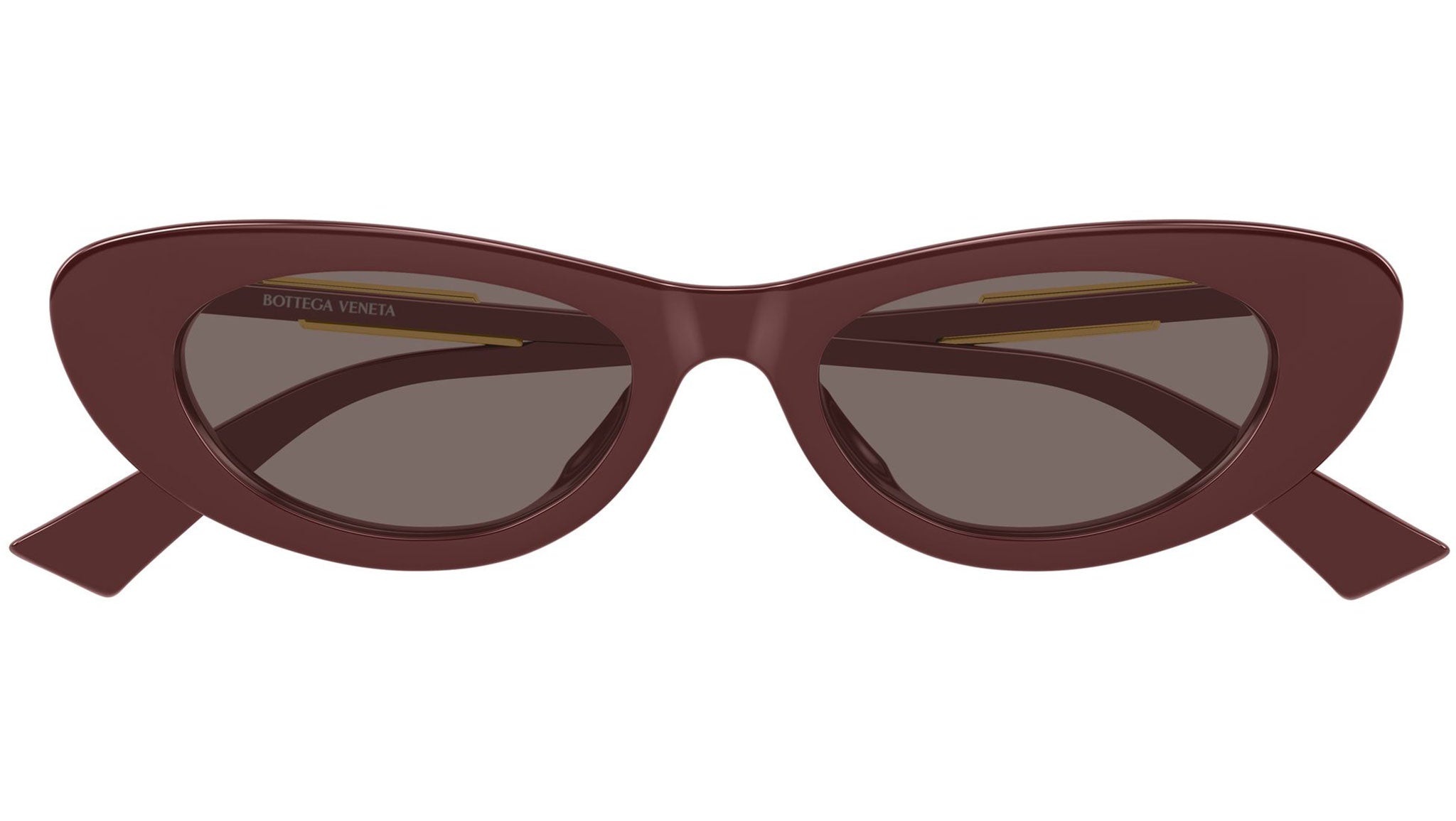 Bottega Veneta BV1447S 003 sunglasses for women, featuring shiny solid barolo burgundy cat eye recycled acetate frame and solid light brown bio nylon lenses. Brand line: Ribbon. Style code: BV1447S. Color code: 003. Made in Italy. Authorized Bottega Veneta online reseller. Your glasses will include the original case and accessories and are covered by a 12-month global warranty.