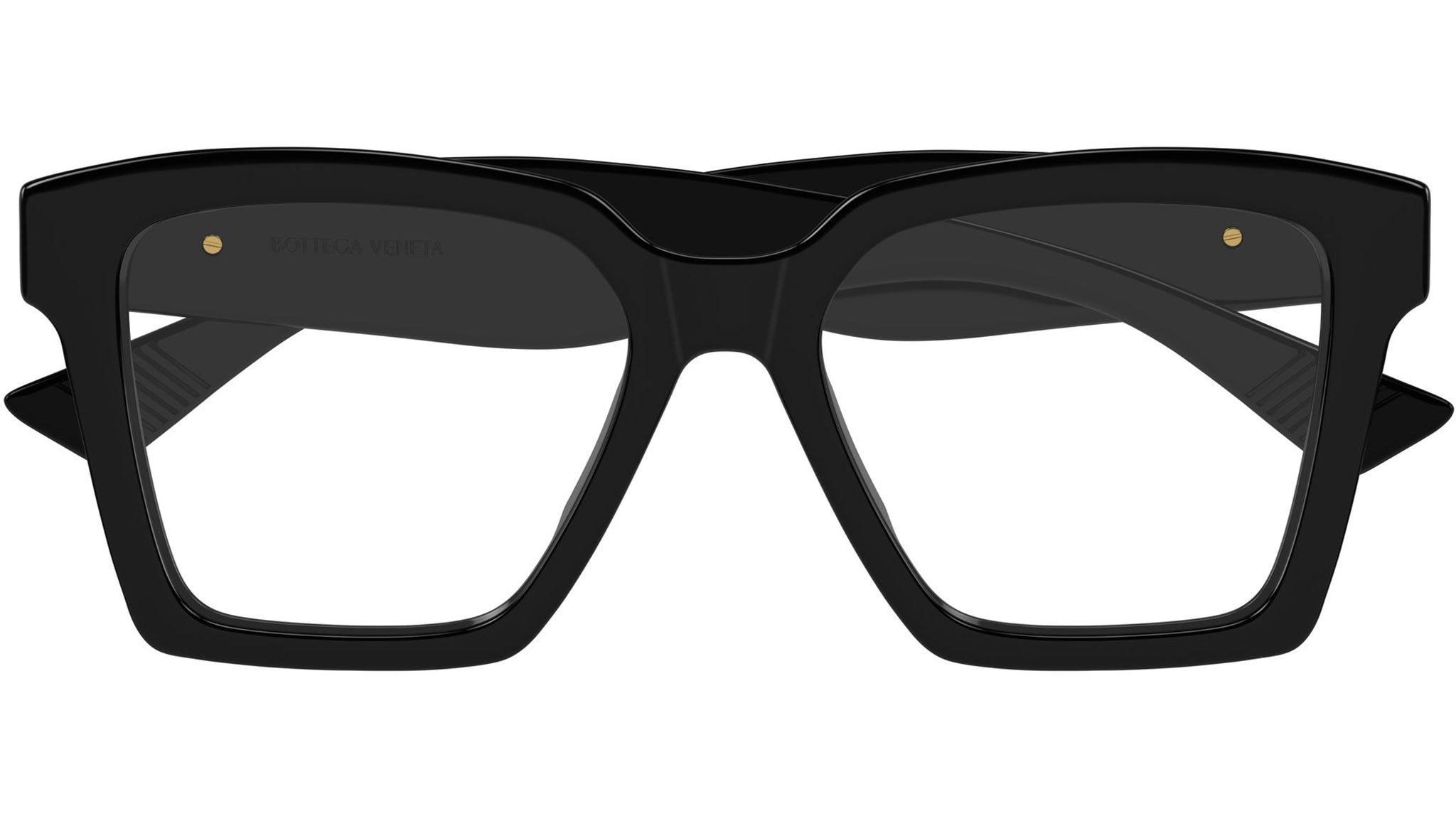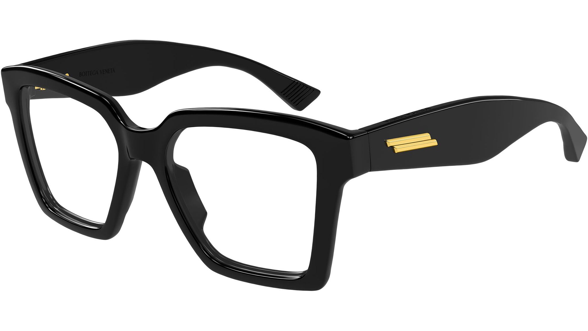 Bottega Veneta BV1458O 001 glasses for women, featuring shiny solid black rectangular recycled acetate frame and demo lenses. Brand line: Ribbon. Style code: BV1458O. Color code: 001. Made in Italy. Authorized Bottega Veneta online reseller. Your glasses will include the original case and accessories and are covered by a 12-month global warranty.