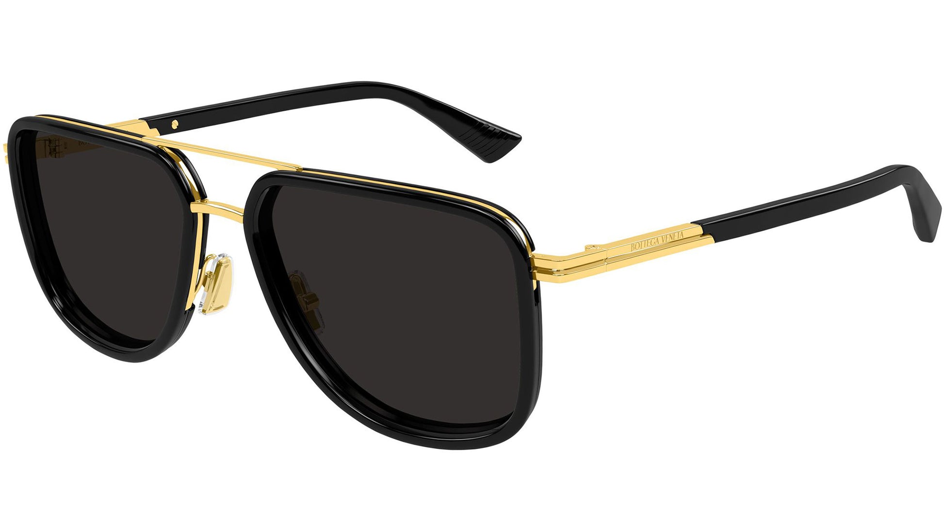 Bottega Veneta BV1463S 001 sunglasses for men, featuring shiny gold with shiny solid black eye-rims pilot metal frame and solid grey bio nylon lenses. Brand line: Ribbon. Style code: BV1463S. Color code: 001. Made in Italy. Authorized Bottega Veneta online reseller. Your glasses will include the original case and accessories and are covered by a 12-month global warranty.