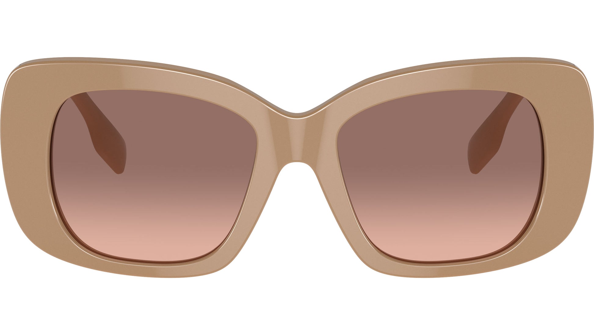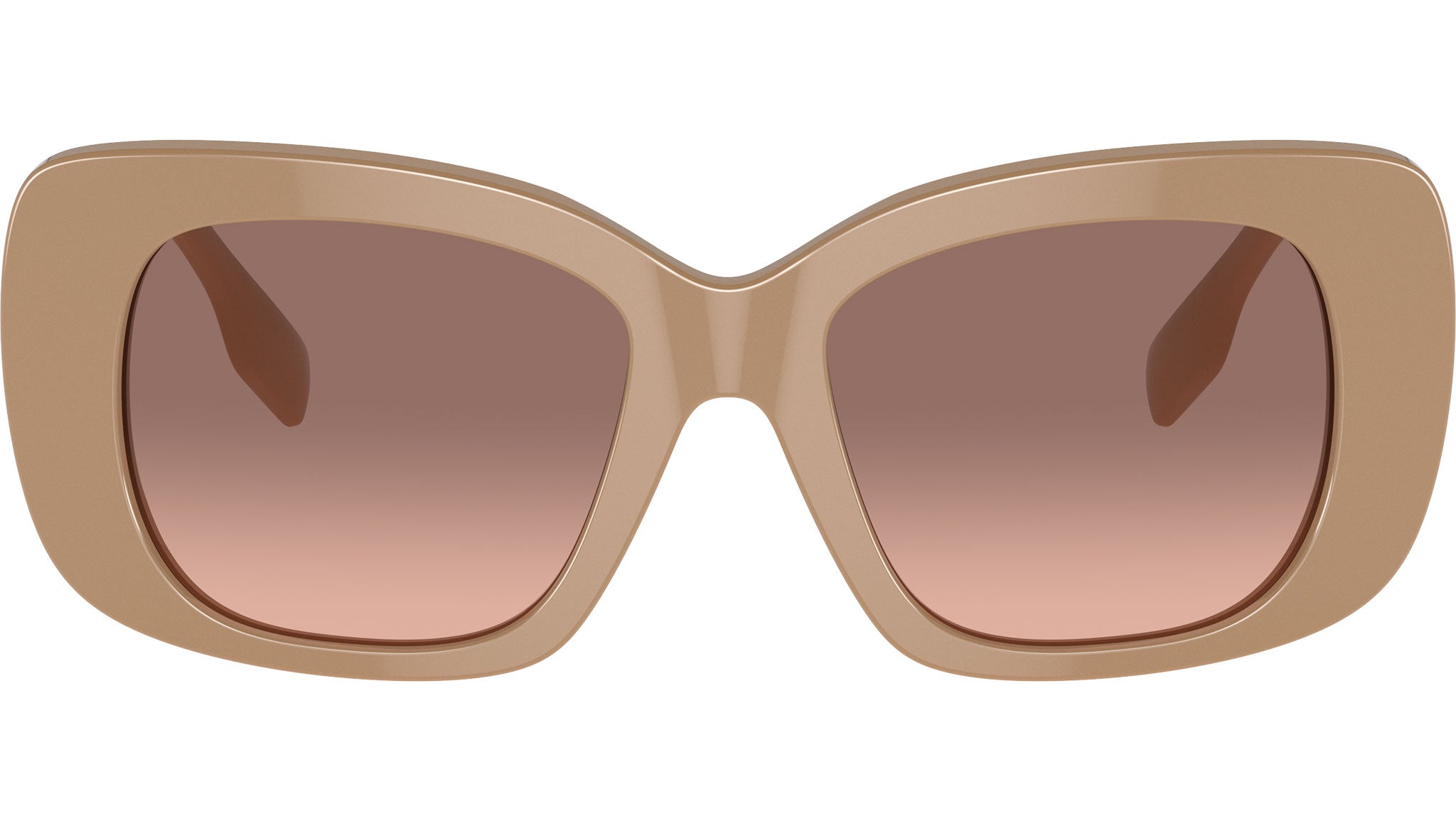 Burberry sunglasses for women model 4410 featuring beige full rim acetate frame and base 4 curve pink gradient dark brown lens. high bridge fit. Frame line: B. Logo Woman. Brand code: BE4410. Color code: 399013. Authorised Burberry Online Reseller. Your glasses will come including the original case and accessories and will be covered by 12 month global warranty.