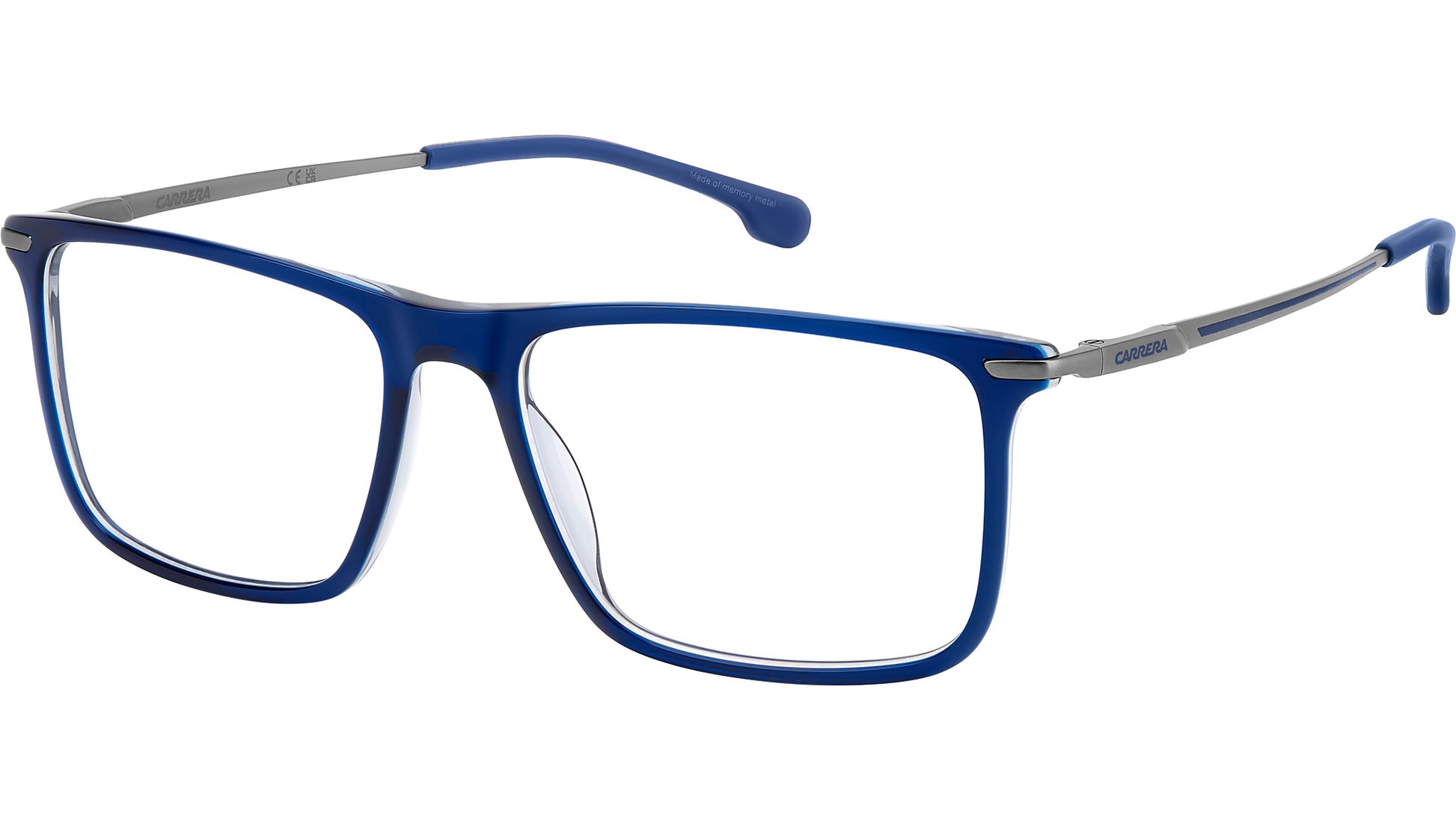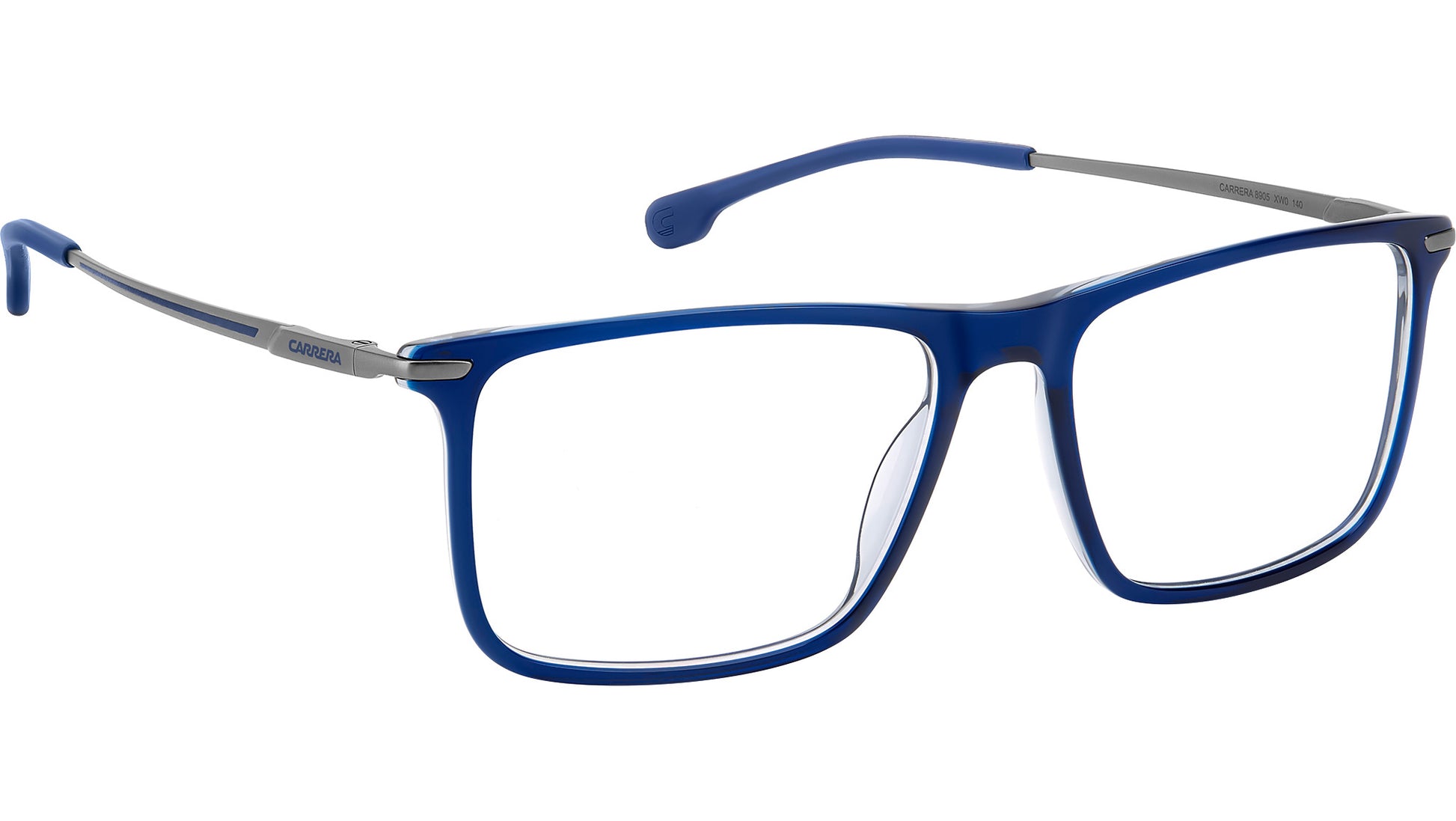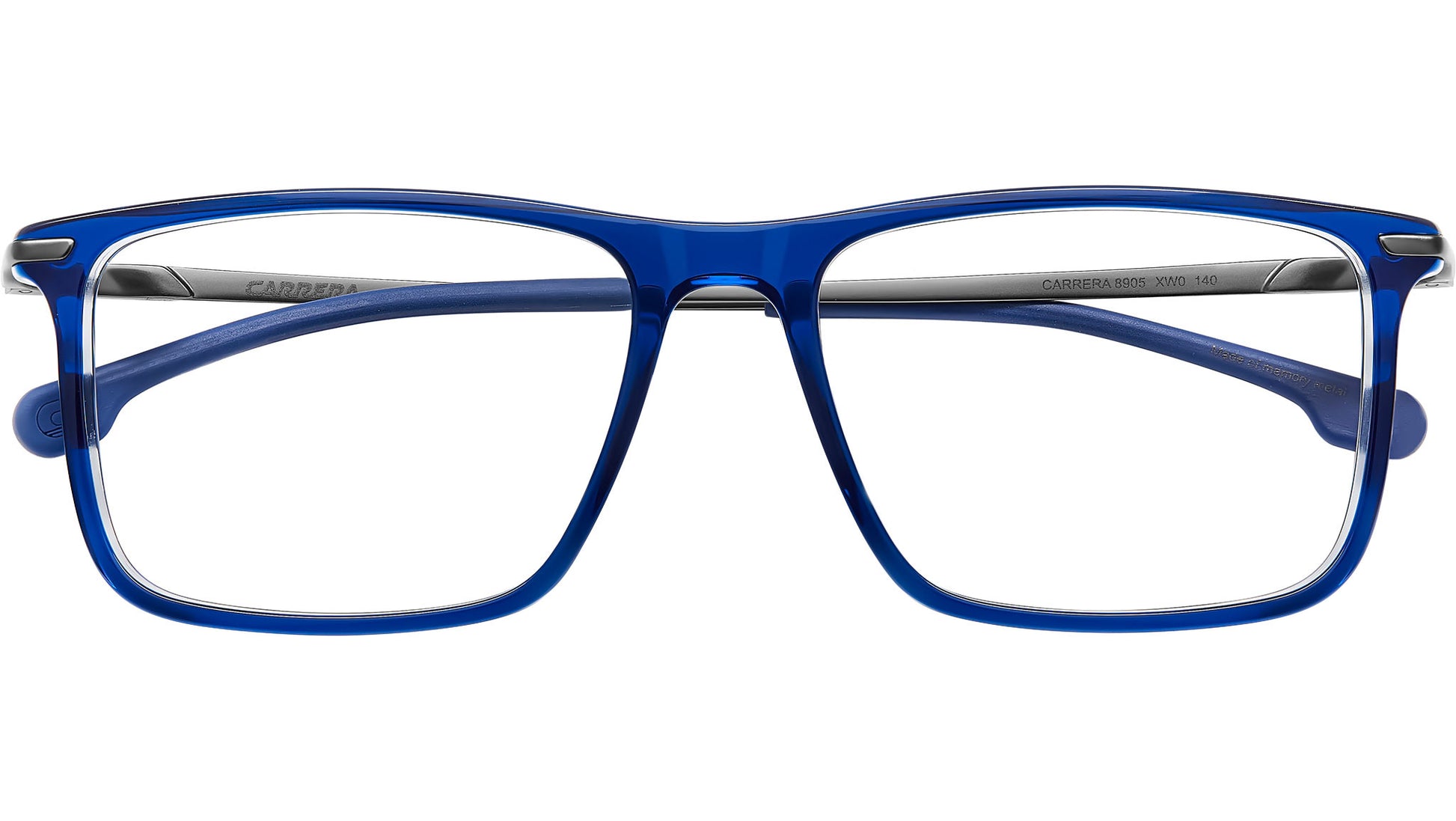 Carrera CARRERA 8905 XW0 glasses for men, featuring blue grey rectangular acetate frame and demo lens lenses. Premium materials and high-quality manufacturing define these Carrera eyeglasses. They're designed for light-as-a-feather comfort, with a slender and compact front in lightweight acetate. Daily use is no problem at all: the Memory Metal temples always return to their original position, even when they're stressed and folded. Everyone can choose their favourite colour palette, each of which is accented by a logo and a tone-on-tone Carrera flag. Brand line: Sport. Style code: 108127. Color code: XW0. Authorized Carrera online reseller. Your glasses will include the original case and accessories and are covered by a 12-month global warranty.