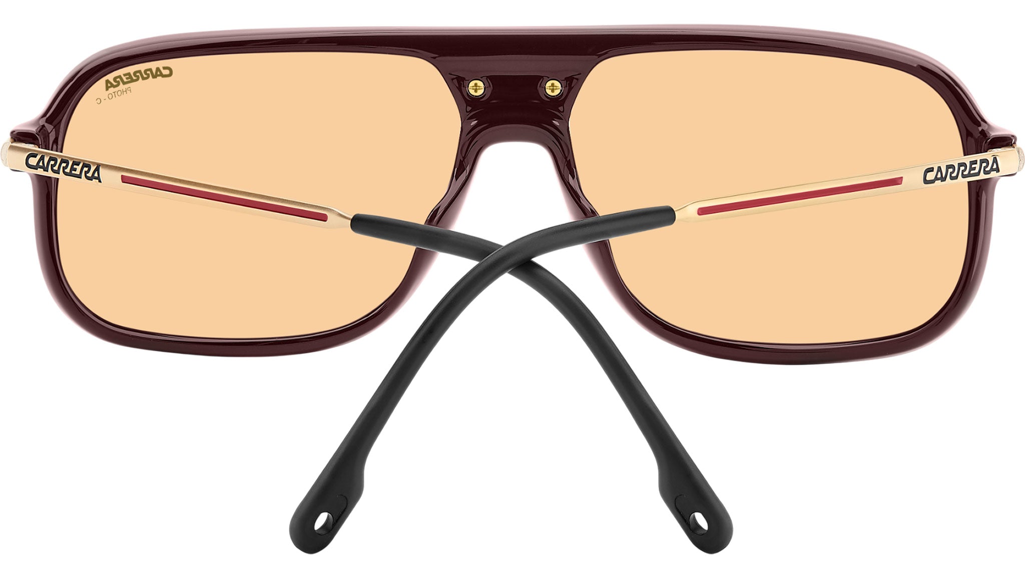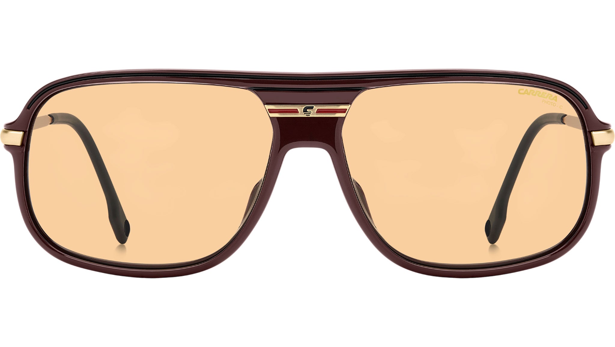 Carrera C SPORT 10/S 6K3 Q6 sunglasses for men, featuring burgundy gold rectangular polyamide frame and orange photochromatic antireflex lenses. These vintage-inspired sunglasses celebrate Carrera's sporting heritage with fashionable flair. The plastic front features the Victory C logo between the lenses and engraved details along the top. The metal temples are defined by their lightweight design, complete with holes on the end tips for an optional elastic band. A retro colour palette completes their vintage look. Polarized or photochromic lenses adapt to active lifestyles. Brand line: Sport. Style code: 208377. Color code: 6K3 Q6. Authorized Carrera online reseller. Your glasses will include the original case and accessories and are covered by a 12-month global warranty.