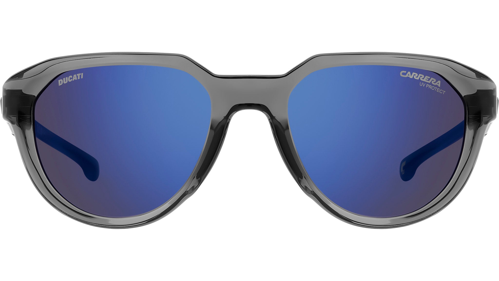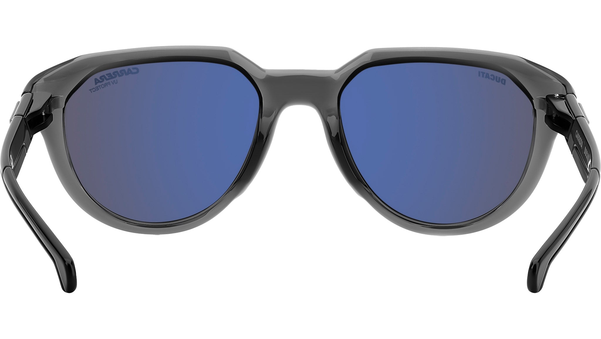 Carrera CARDUC 050/S KB7 XT sunglasses for men, featuring grey round nylon frame and blu sky mirror lenses. Champions of motorcycle racing, champions of style: these Carrera | Ducati sunglasses unite performance and aesthetics. Their inspiration comes from the racing paddock – and it shows: a multifaceted geometric front and bold temples with a metal insert, logo and linear grooves, also in contrast options. And if that weren’t enough, the mirrored version is even more daring. Brand line: Paddock. Style code: 207875. Color code: KB7 XT. Authorized Carrera online reseller. Your glasses will include the original case and accessories and are covered by a 12-month global warranty.
