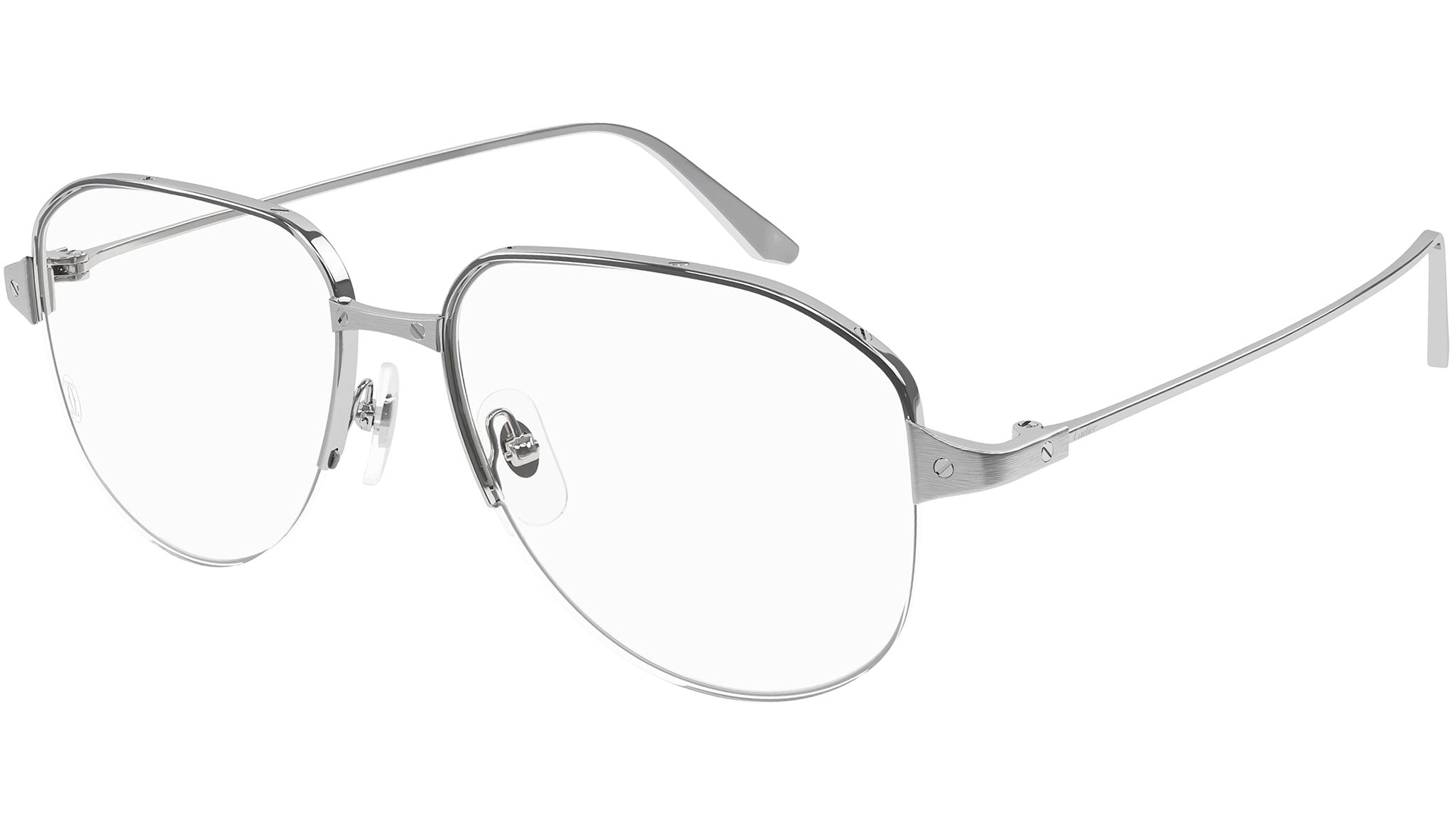 Cartier Core Range optical collection model CT0352O 002 featuring smooth and brushed platinum finish frame and silver temple.