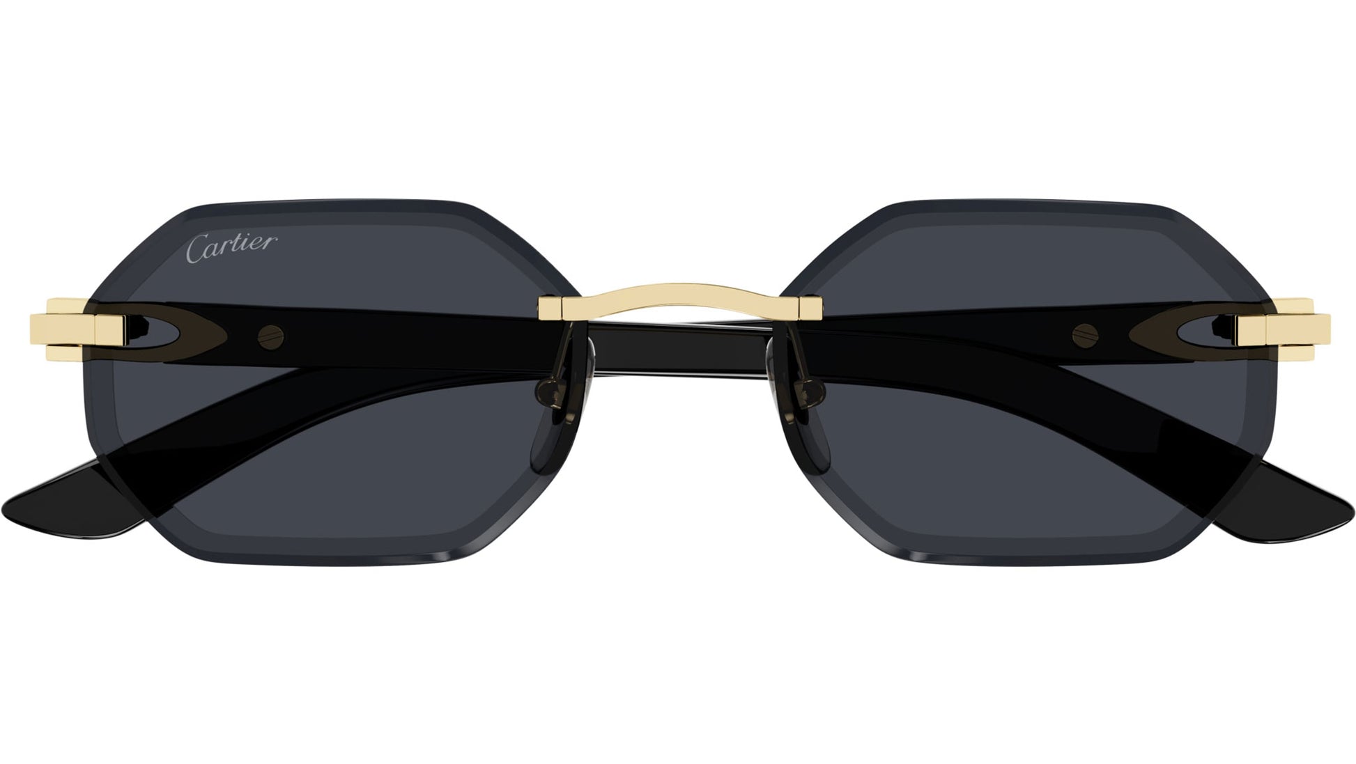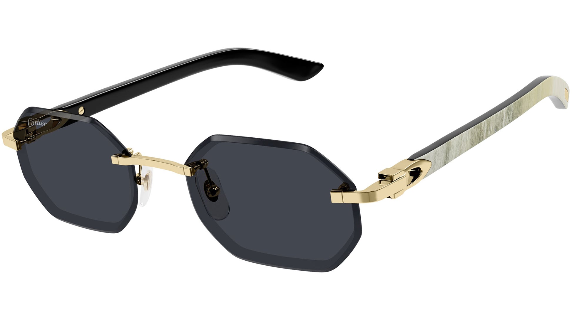 Cartier Exception sunglasses model CT0439S geometric metal frame color code 002 smooth golden finish with white temple and grey lens.
