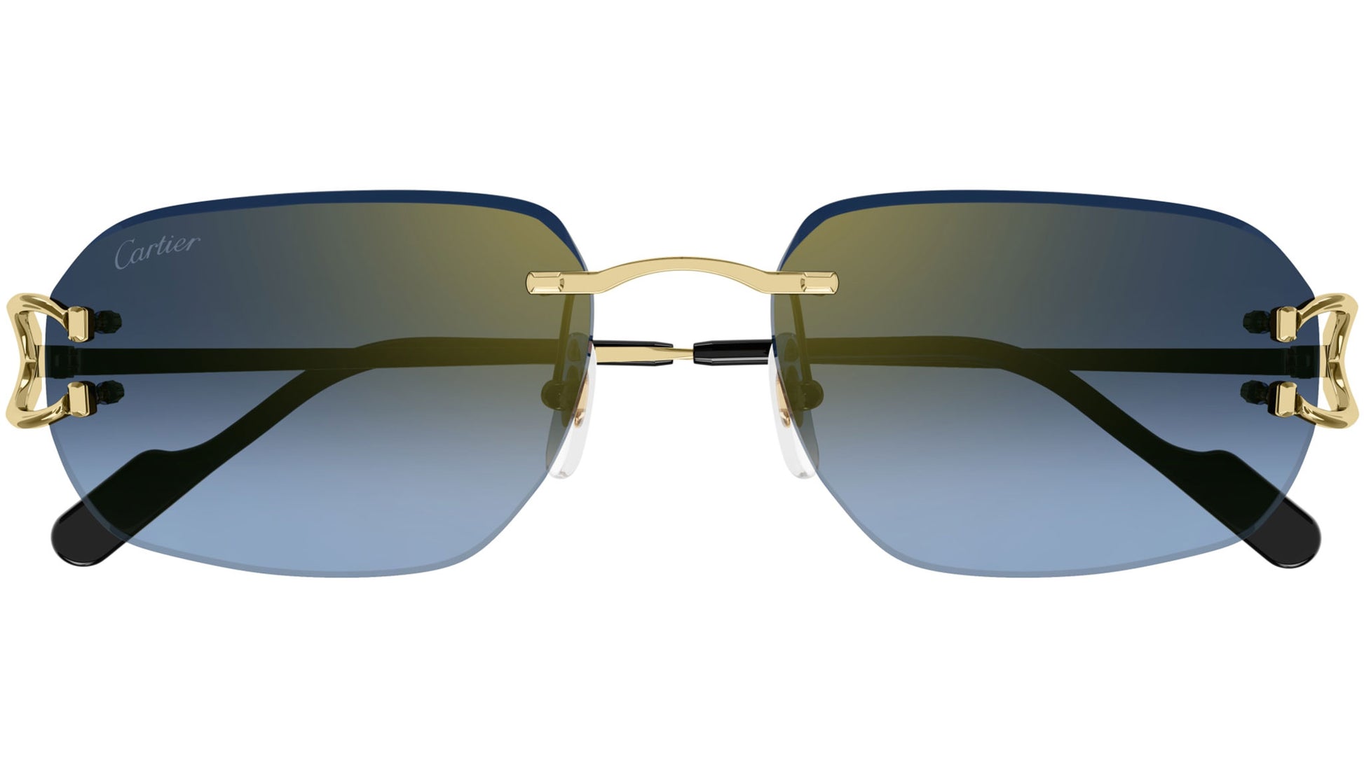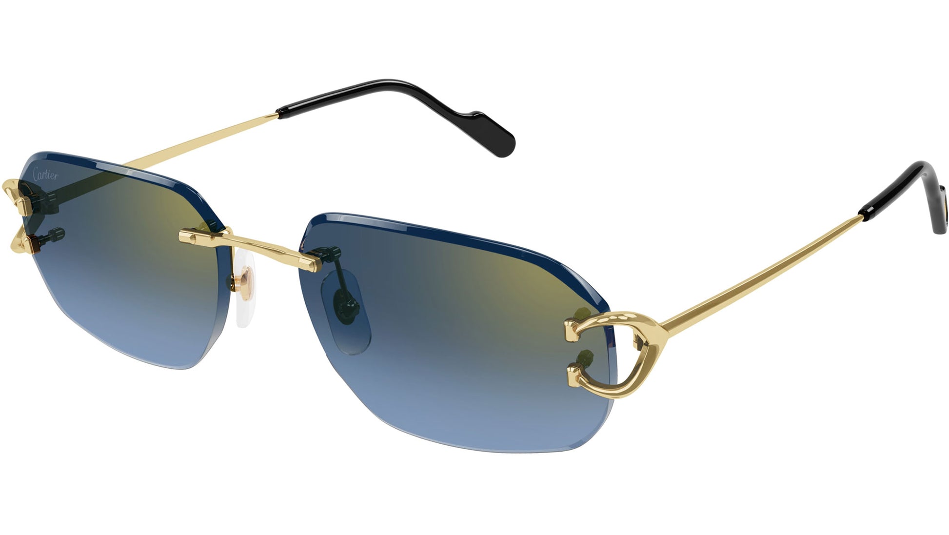 Cartier Core Range sunglasses model CT0468S aviator metal frame color code 002 smooth golden finish with gold temple and graded blue and azure with a golden flash lens.