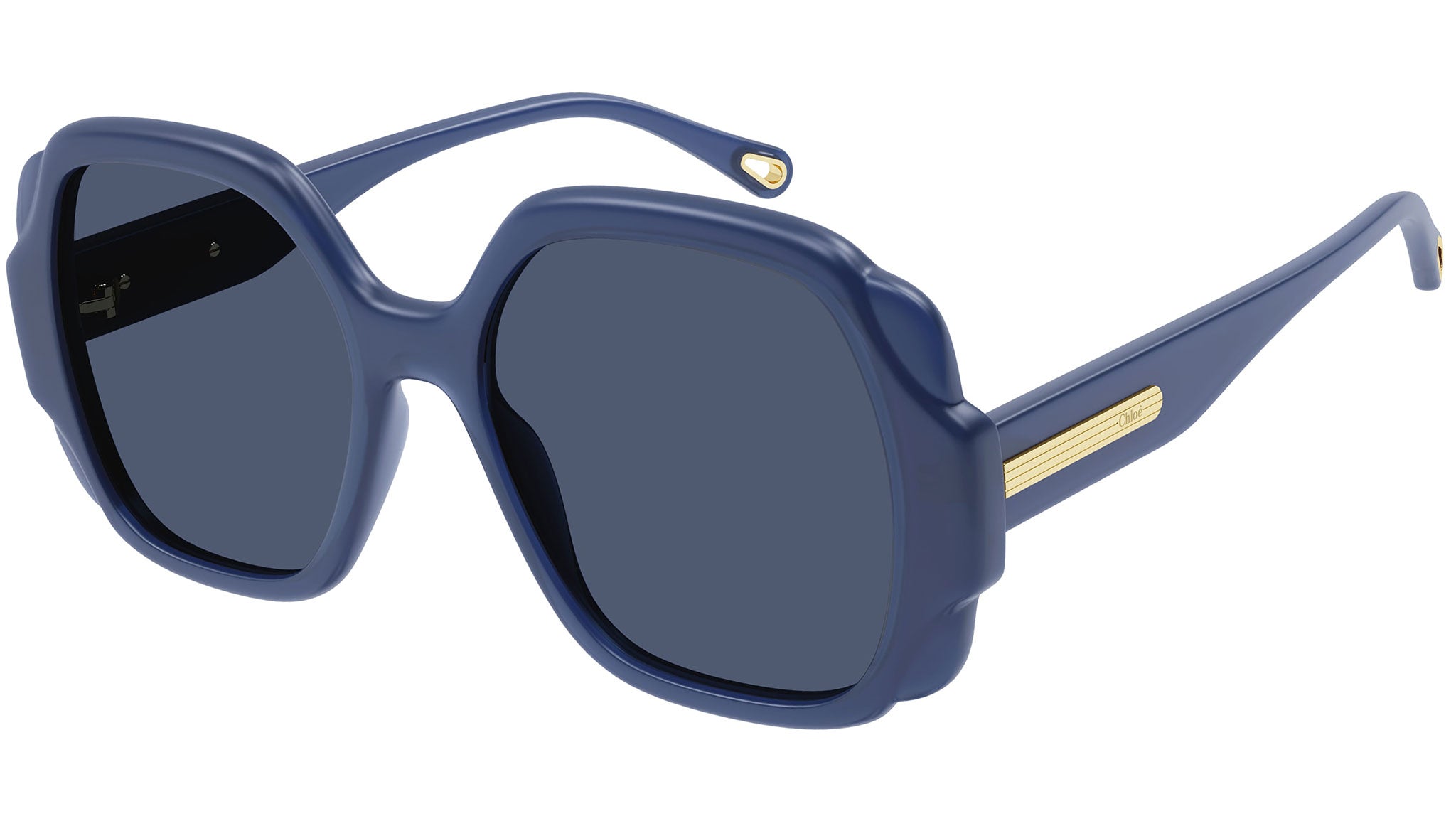Chloé CH0121S 002 sunglasses for women, featuring matte opal blue geometric recycled injection frame and solid blue bio nylon lenses. Brand line: Chloé. Style code: CH0121S. Color code: 002. Made in Italy. Authorized Chloé online reseller. Your glasses will include the original case and accessories and are covered by a 12-month global warranty.