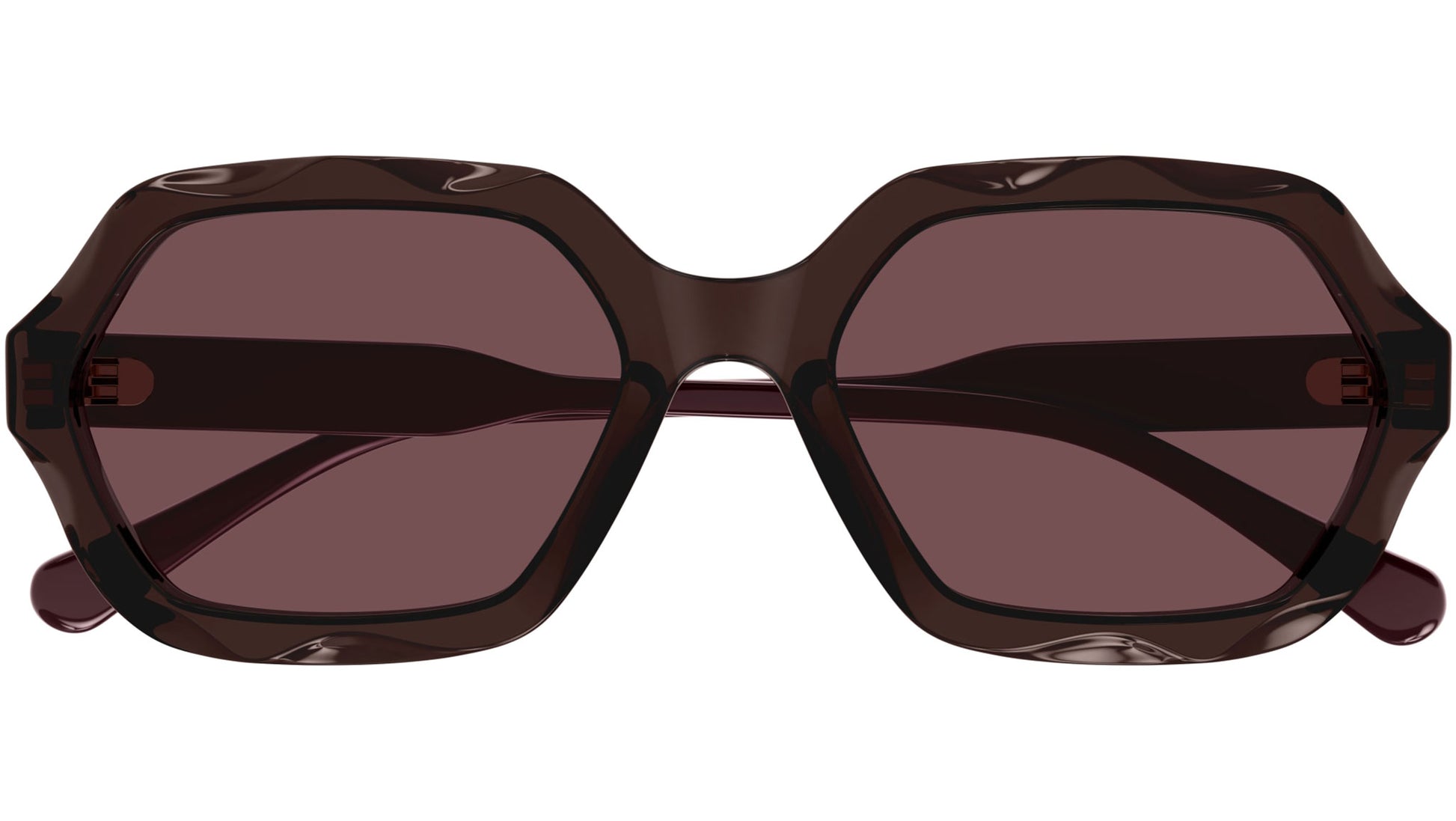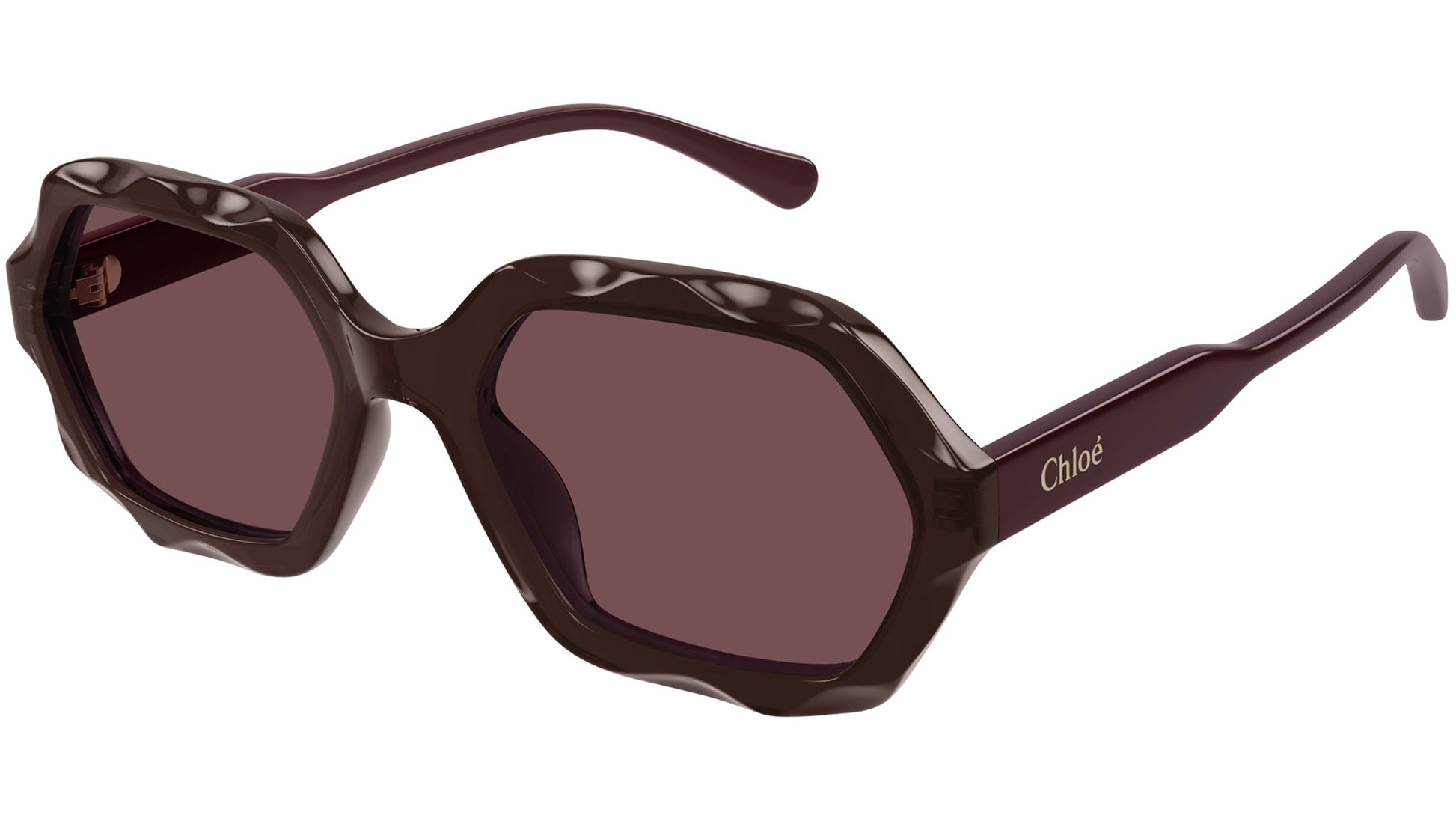Chloé CH0227S 002 sunglasses for women, featuring shiny transparent dark mauve rectangular recycled acetate frame and solid dark violet bio nylon lenses. Brand line: Chloé. Style code: CH0227S. Color code: 002. Made in Italy. Authorized Chloé online reseller. Your glasses will include the original case and accessories and are covered by a 12-month global warranty.