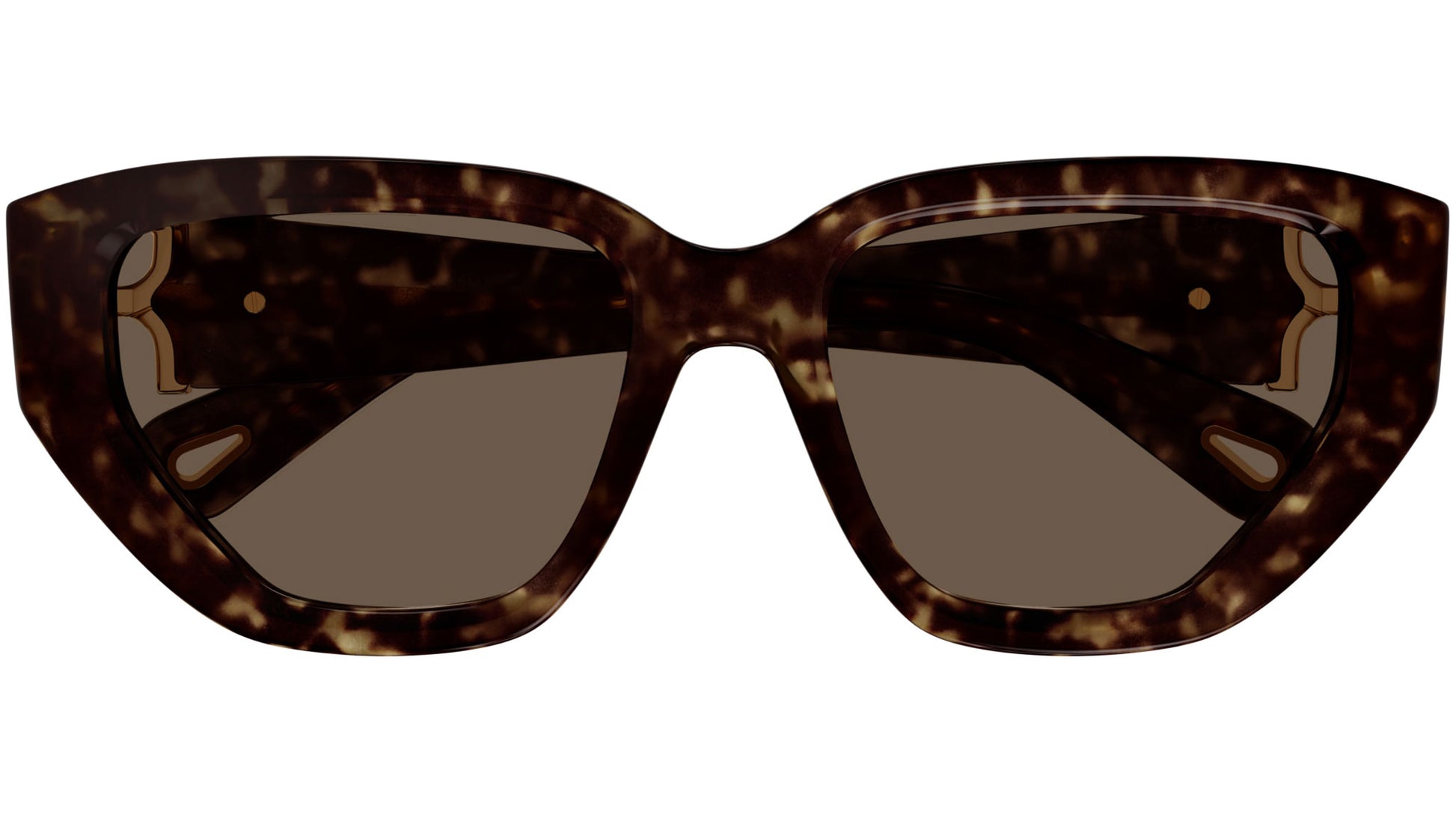 Chloé CH0235S 002 sunglasses for women, featuring shiny dark havana cat eye recycled acetate frame and solid brown bio nylon lenses. Brand line: Chloé. Style code: CH0235S. Color code: 002. Made in Japan. Authorized Chloé online reseller. Your glasses will include the original case and accessories and are covered by a 12-month global warranty.