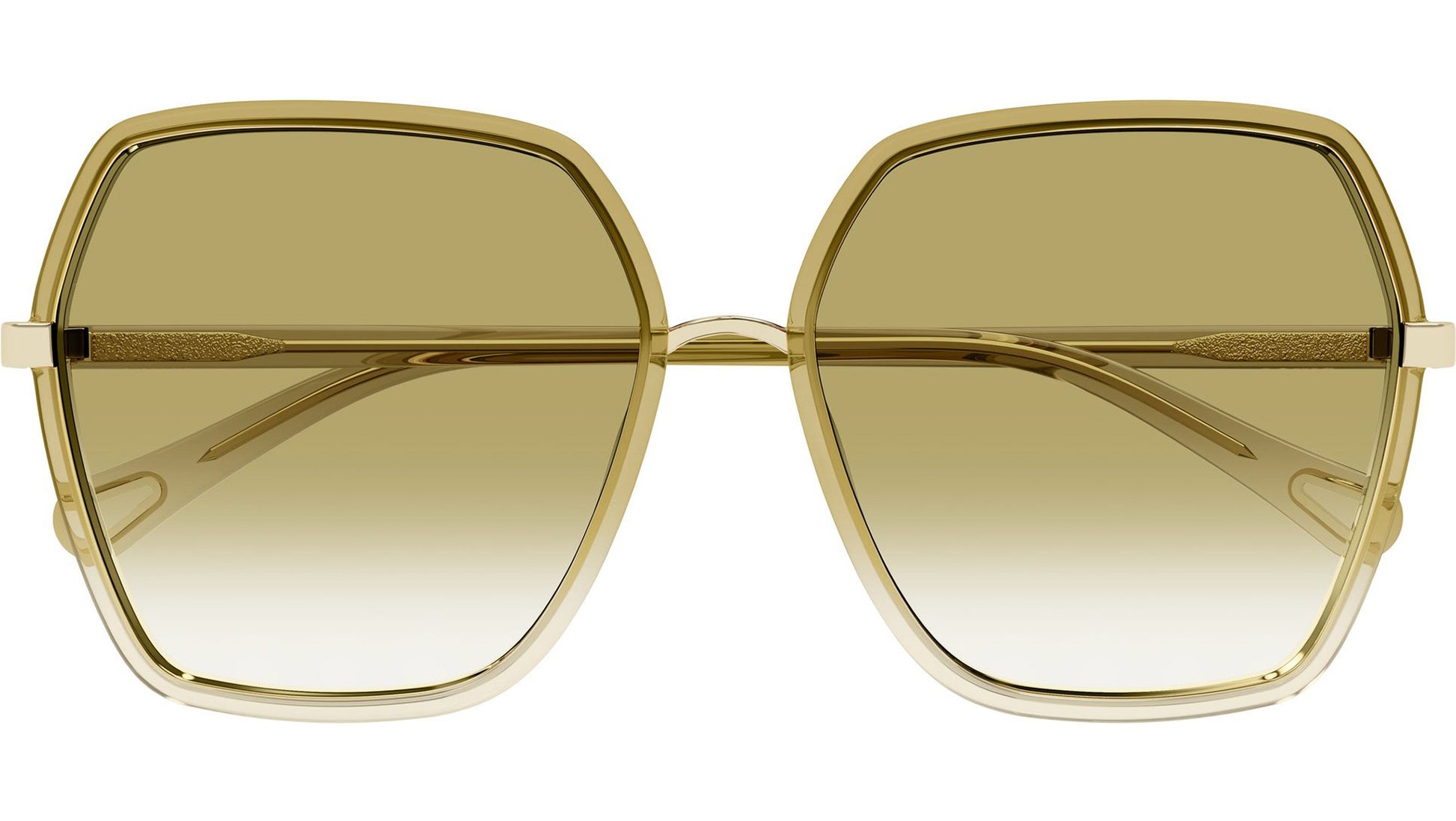Chloé CH0262S 006 sunglasses for women, featuring shiny transparent honey to transparent shiny cream rectangular injection frame and gradient mud green / crystal bio nylon lenses. Brand line: Chloé. Style code: CH0262S. Color code: 006. Made in Italy. Authorized Chloé online reseller. Your glasses will include the original case and accessories and are covered by a 12-month global warranty.