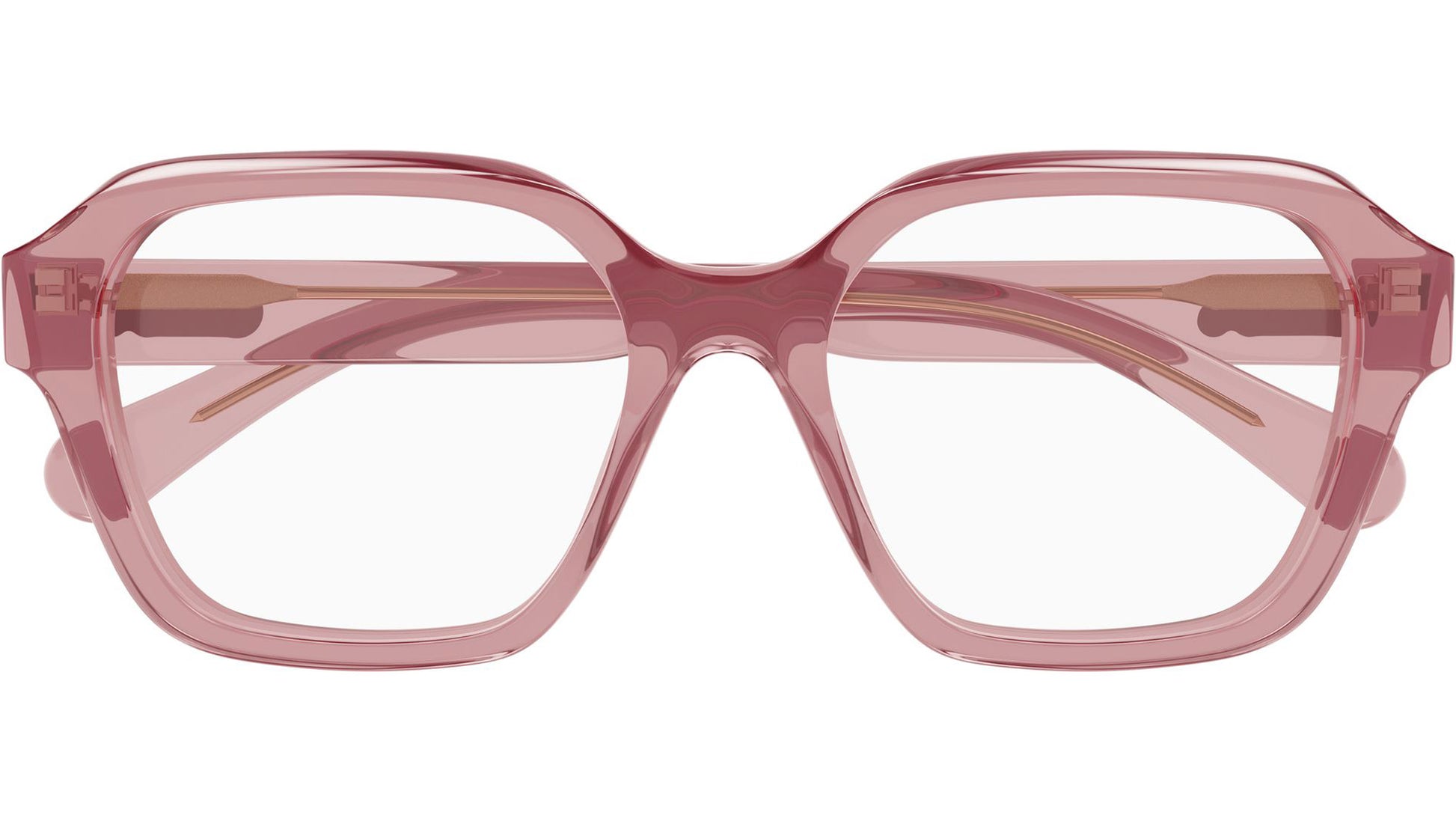 Chloé CH0272O 006 glasses for women, featuring shiny transparent antic rose rectangular recycled acetate frame and demo lenses. Brand line: Chloé. Style code: CH0272O. Color code: 006. Made in Italy. Authorized Chloé online reseller. Your glasses will include the original case and accessories and are covered by a 12-month global warranty.