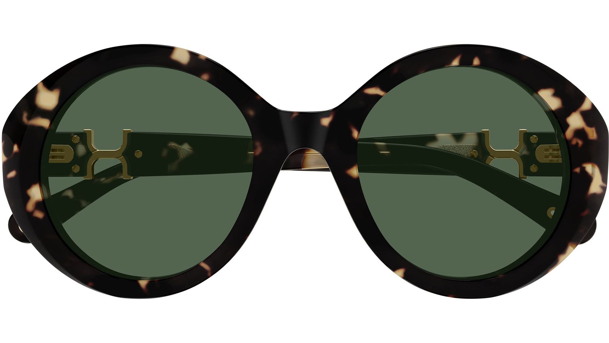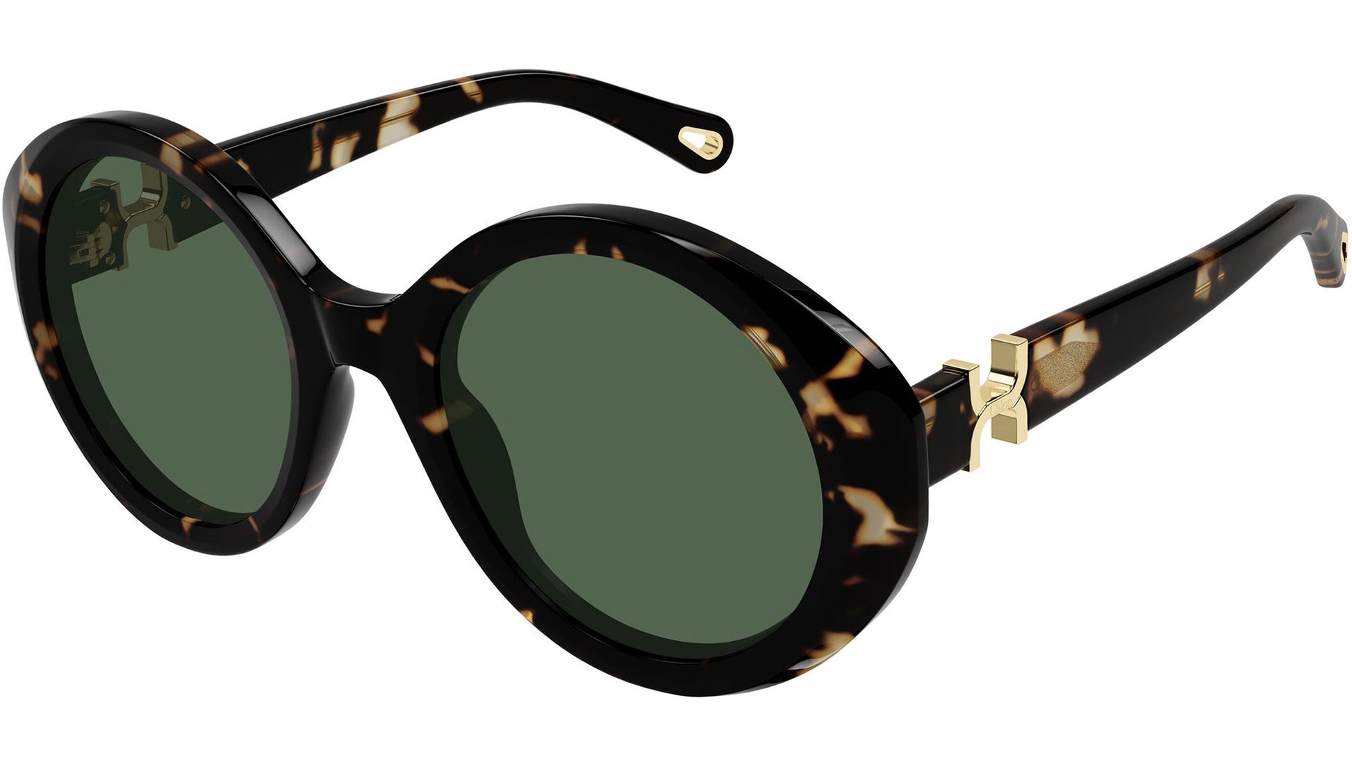 Chloé CH0332S 002 sunglasses for women, featuring shiny dark havana spot beige panthos recycled acetate frame and solid dark green bio nylon lenses. Brand line: Chloé. Style code: CH0332S. Color code: 002. Made in Japan. Authorized Chloé online reseller. Your glasses will include the original case and accessories and are covered by a 12-month global warranty.