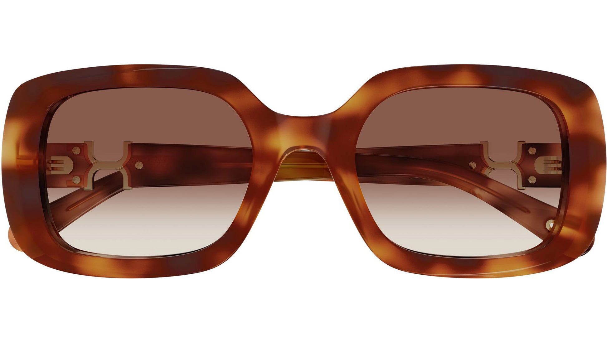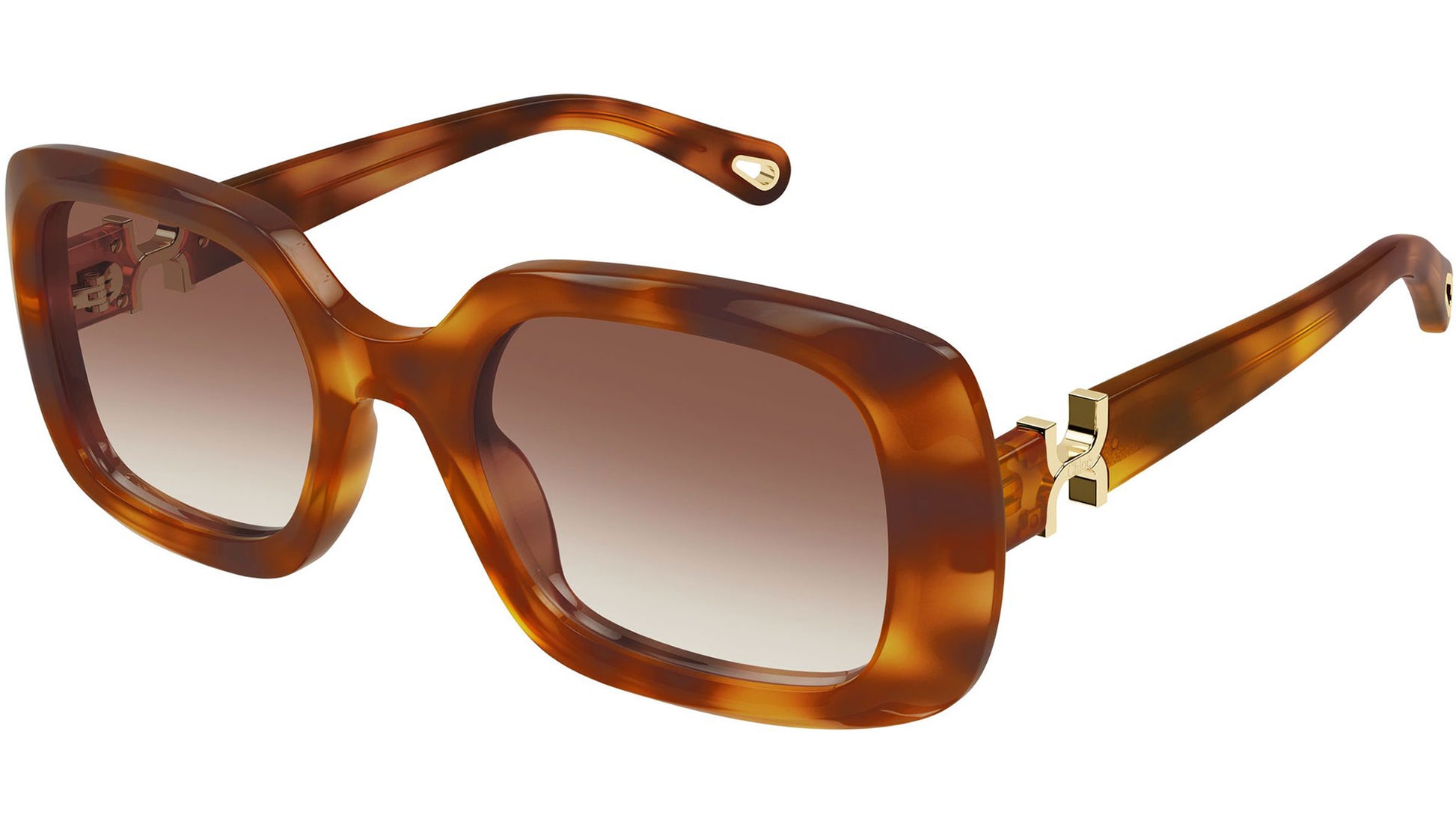 Chloé CH0333S 003 sunglasses for women, featuring shiny blonde havana rectangular recycled acetate frame and gradient brown bio nylon lenses. Brand line: Chloé. Style code: CH0333S. Color code: 003. Made in Japan. Authorized Chloé online reseller. Your glasses will include the original case and accessories and are covered by a 12-month global warranty.