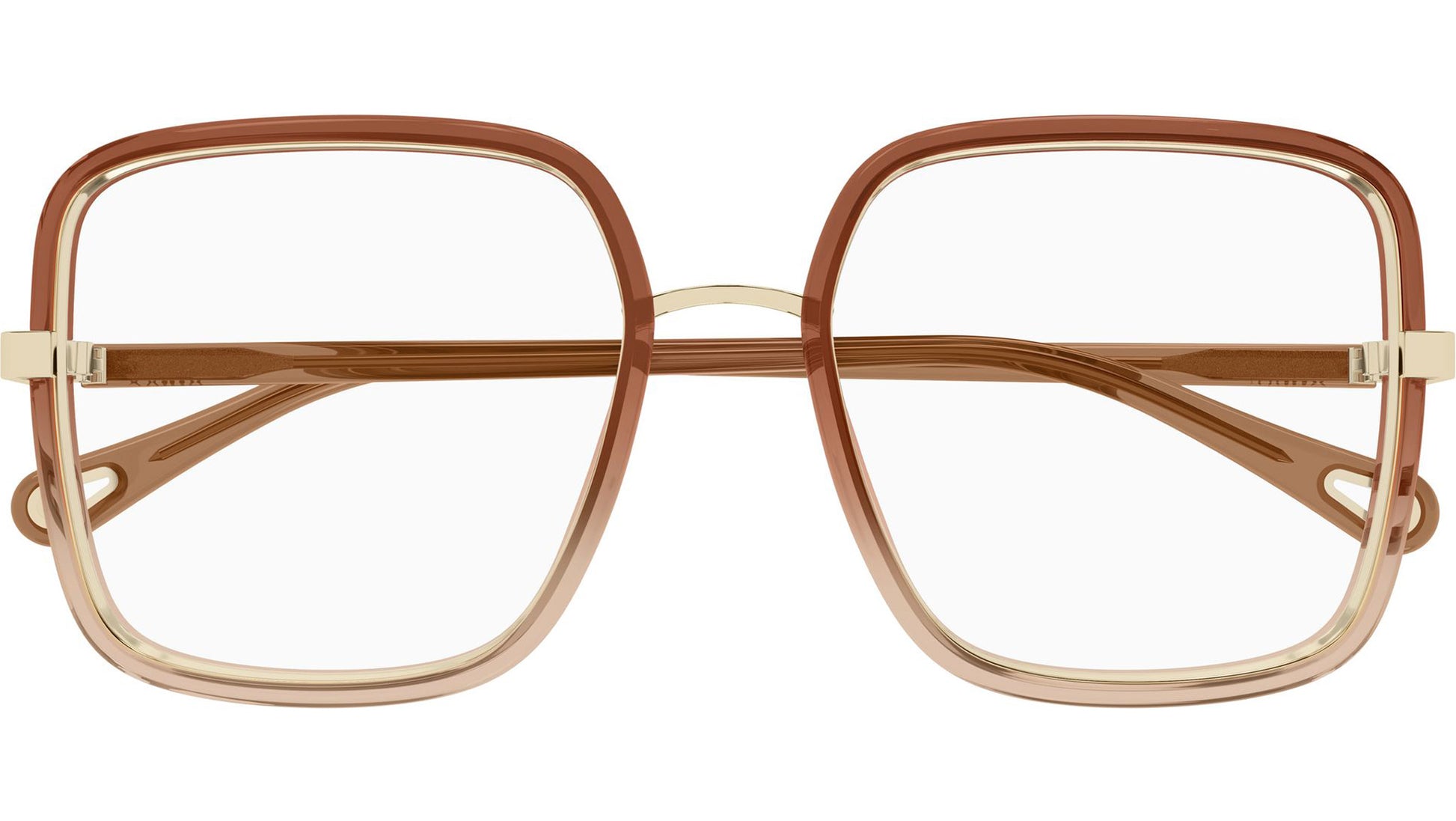 Chloé CH0338O 003 glasses for women, featuring shiny transparent brown to transparent shiny transparent beige rectangular injection frame and demo lenses. Brand line: Chloé. Style code: CH0338O. Color code: 003. Made in Italy. Authorized Chloé online reseller. Your glasses will include the original case and accessories and are covered by a 12-month global warranty.