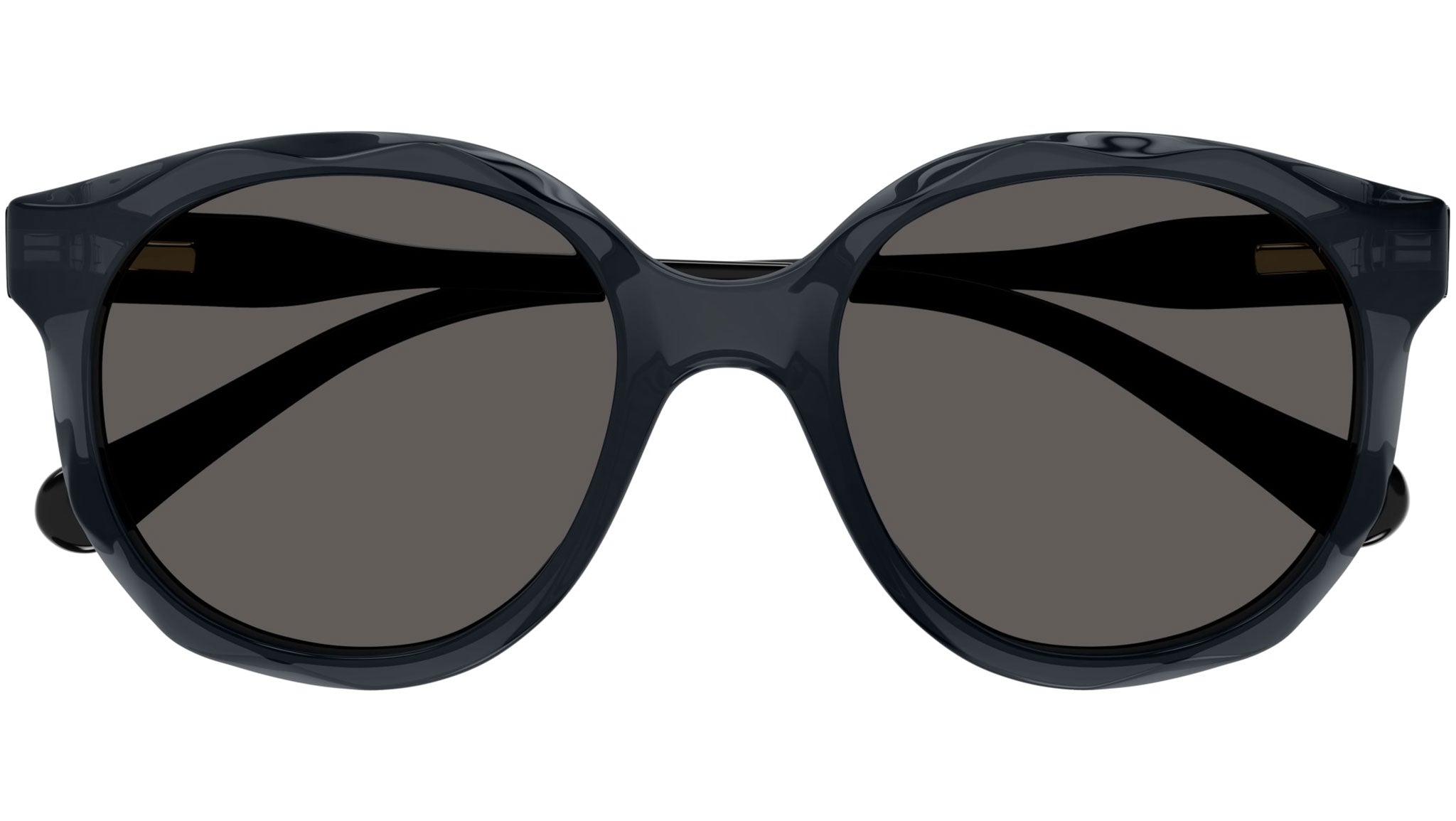 Chloé Kids sunglasses model CC0019S junior line panthos recycled acetate frame, color code 001 shiny transparent dark grey with black temple and solid grey lens.
