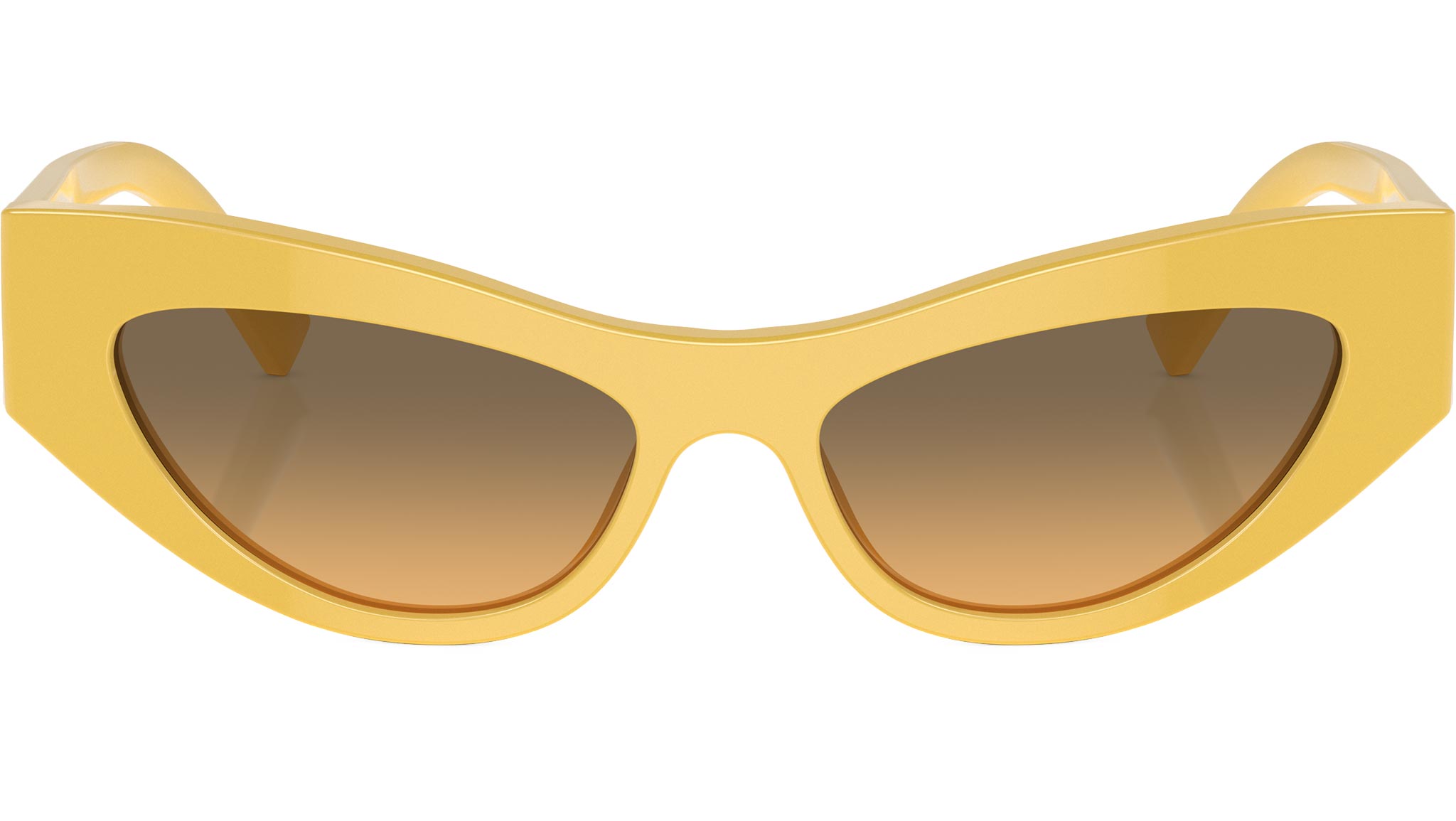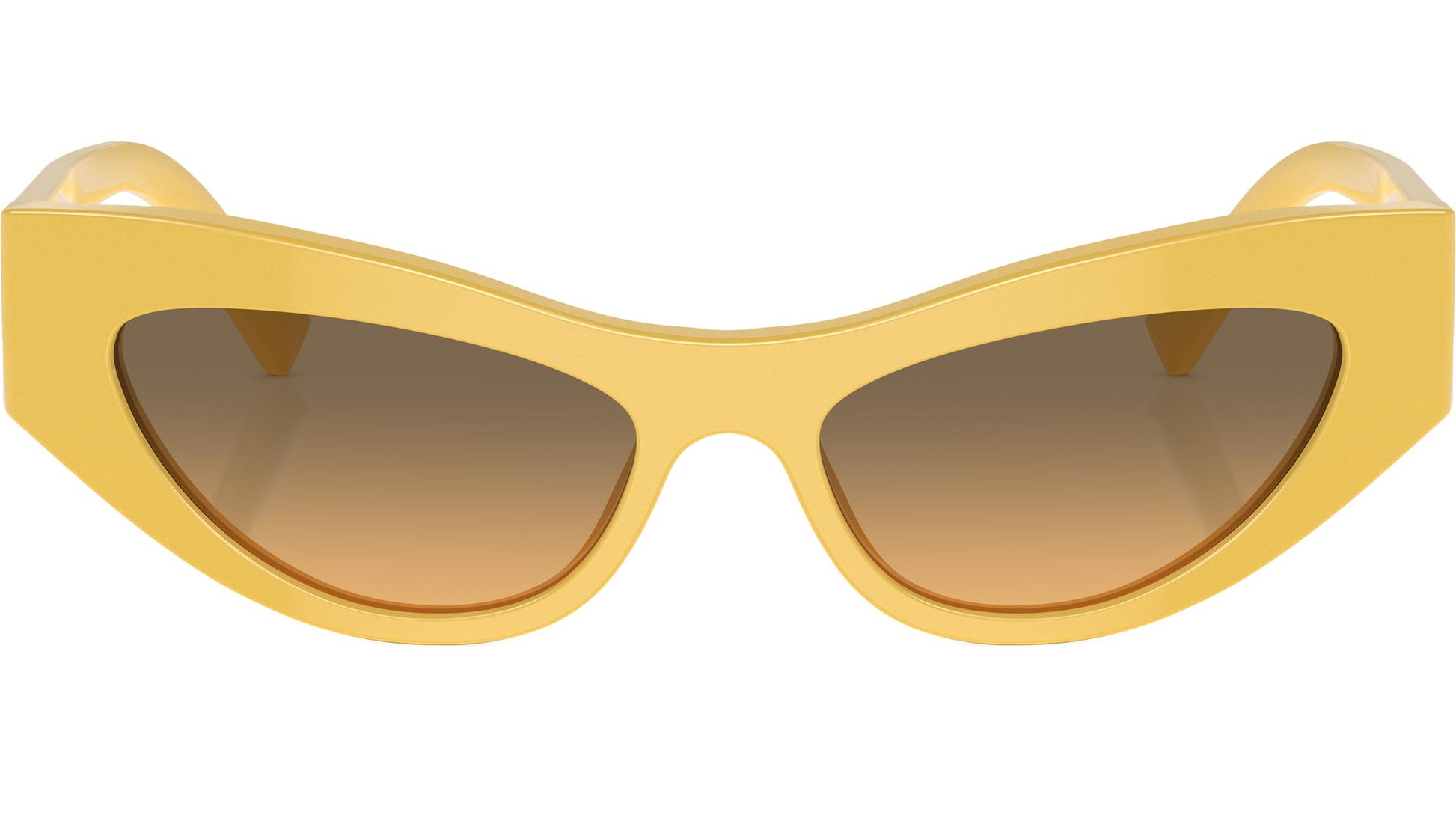 Dolce & Gabbana sunglasses for women model 4450 featuring yellow full rim acetate frame and base 4 curve yellow gradient grey lenses. High bridge fit. Frame line: Dna. Brand code: DG4450. Color code: 333411. Size: M suitable for medium faces. Authorised Dolce & Gabbana Online Reseller. Your glasses will come including the original case and accessories and will be covered by 12 month global warranty.