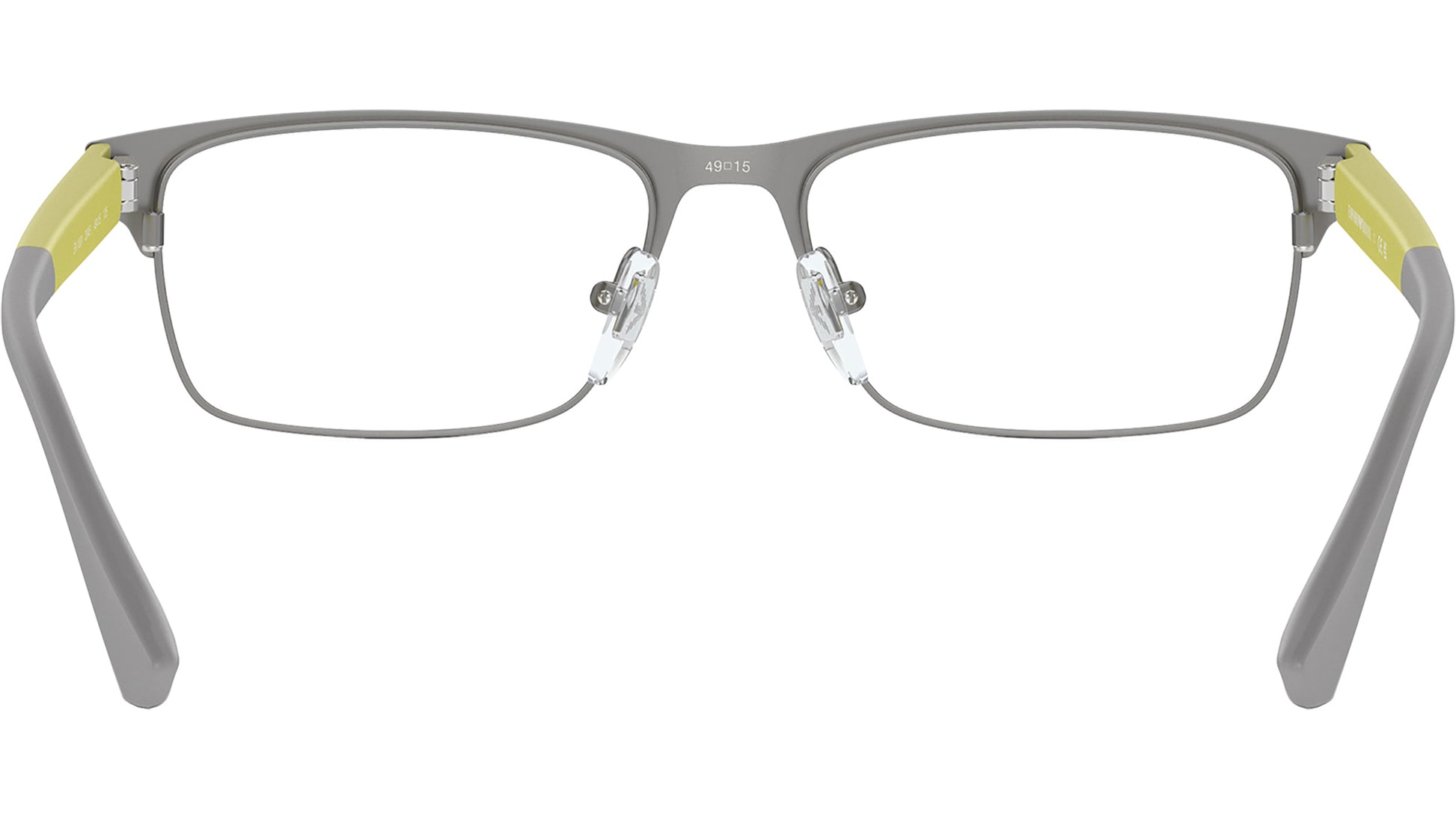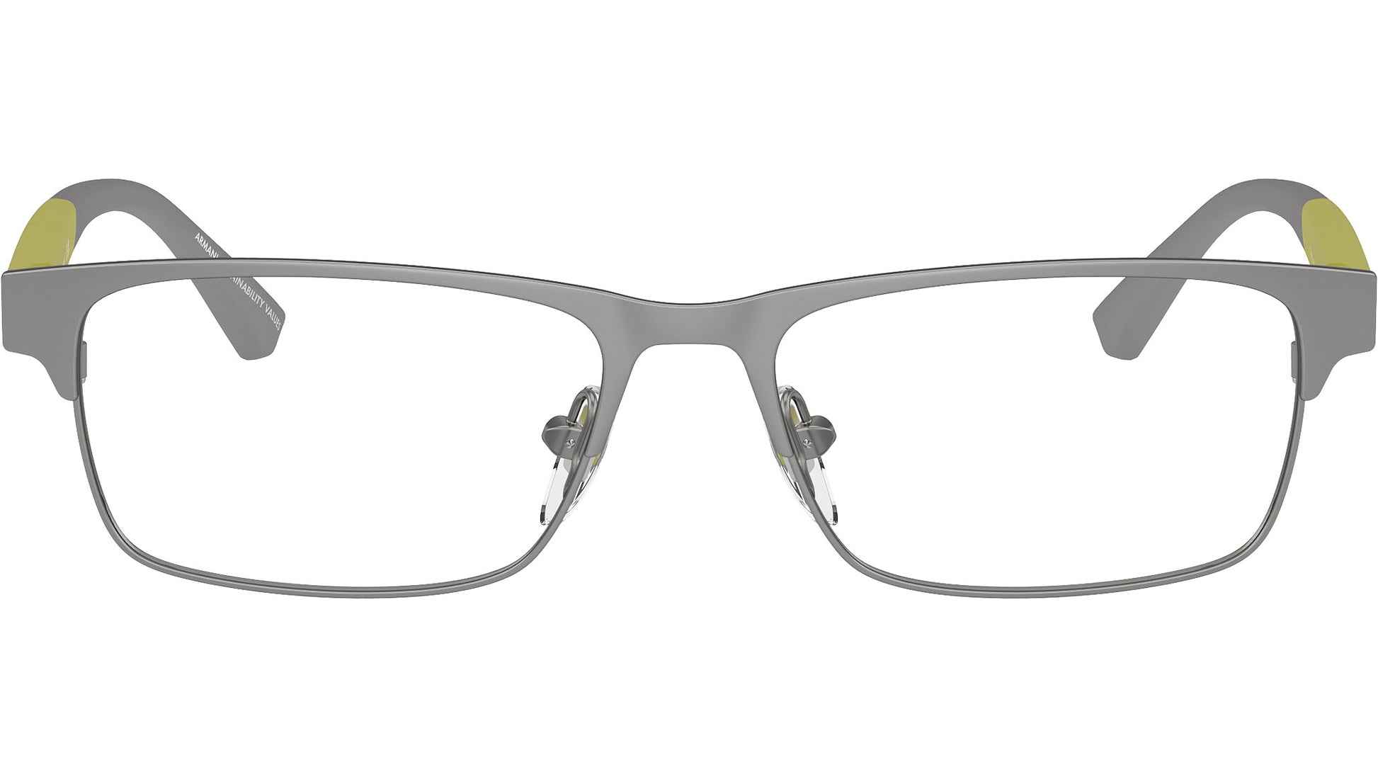 Emporio Armani Kids EK1001 3045 glasses, featuring matte silver rectangular metal frame and demo lenses. Adjustable nosepads. Brand line: Essential Leisure. Style code: 0EK1001. Color code: 3045. Authorized Emporio Armani Kids online reseller. Your glasses will include the original case and accessories and are covered by a 12-month global warranty.
