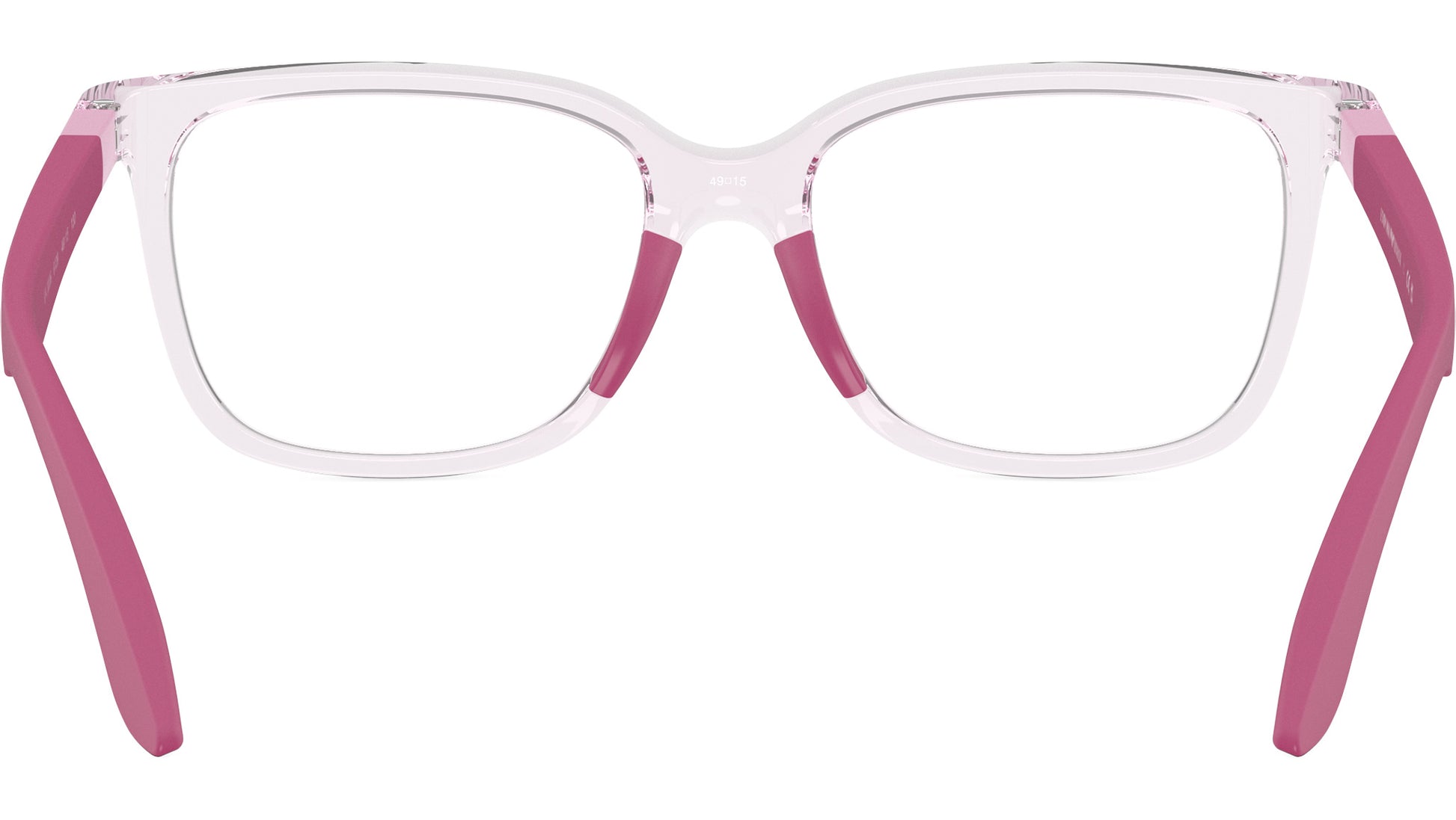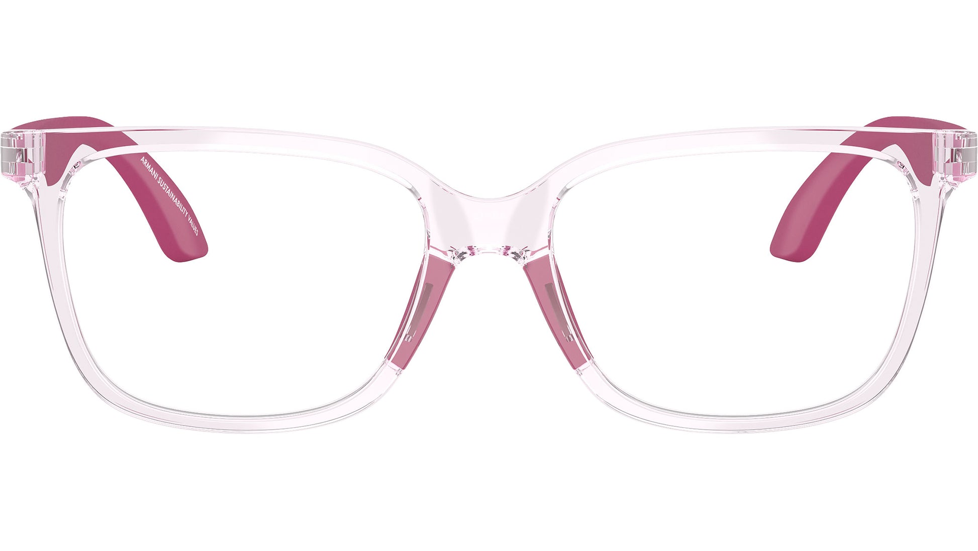 Emporio Armani Kids EK3006 6139 glasses, featuring shiny transparent pink d-frame injection frame and demo lenses. High bridge fit. Brand line: Essential Leisure. Style code: 0EK3006. Color code: 6139. Authorized Emporio Armani Kids online reseller. Your glasses will include the original case and accessories and are covered by a 12-month global warranty.