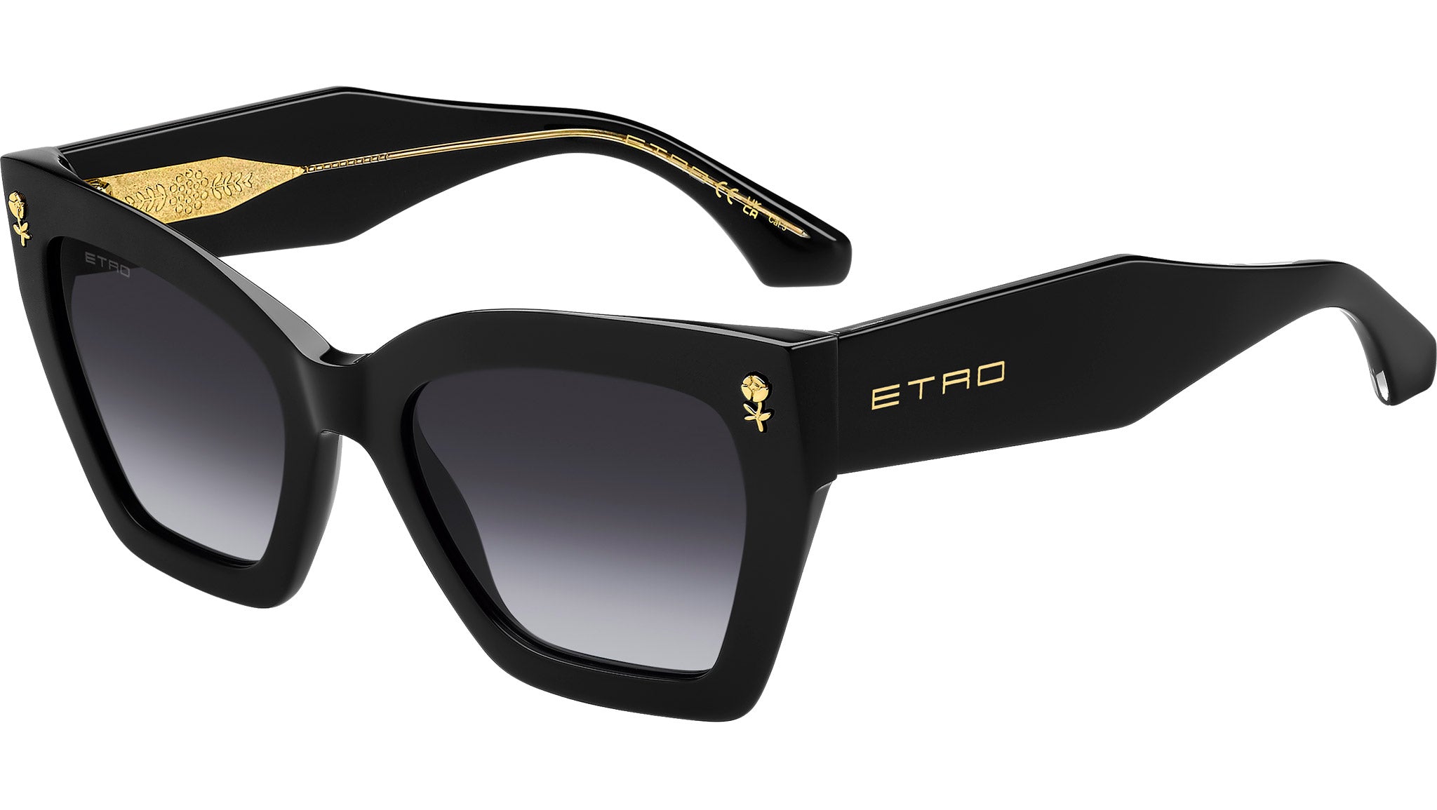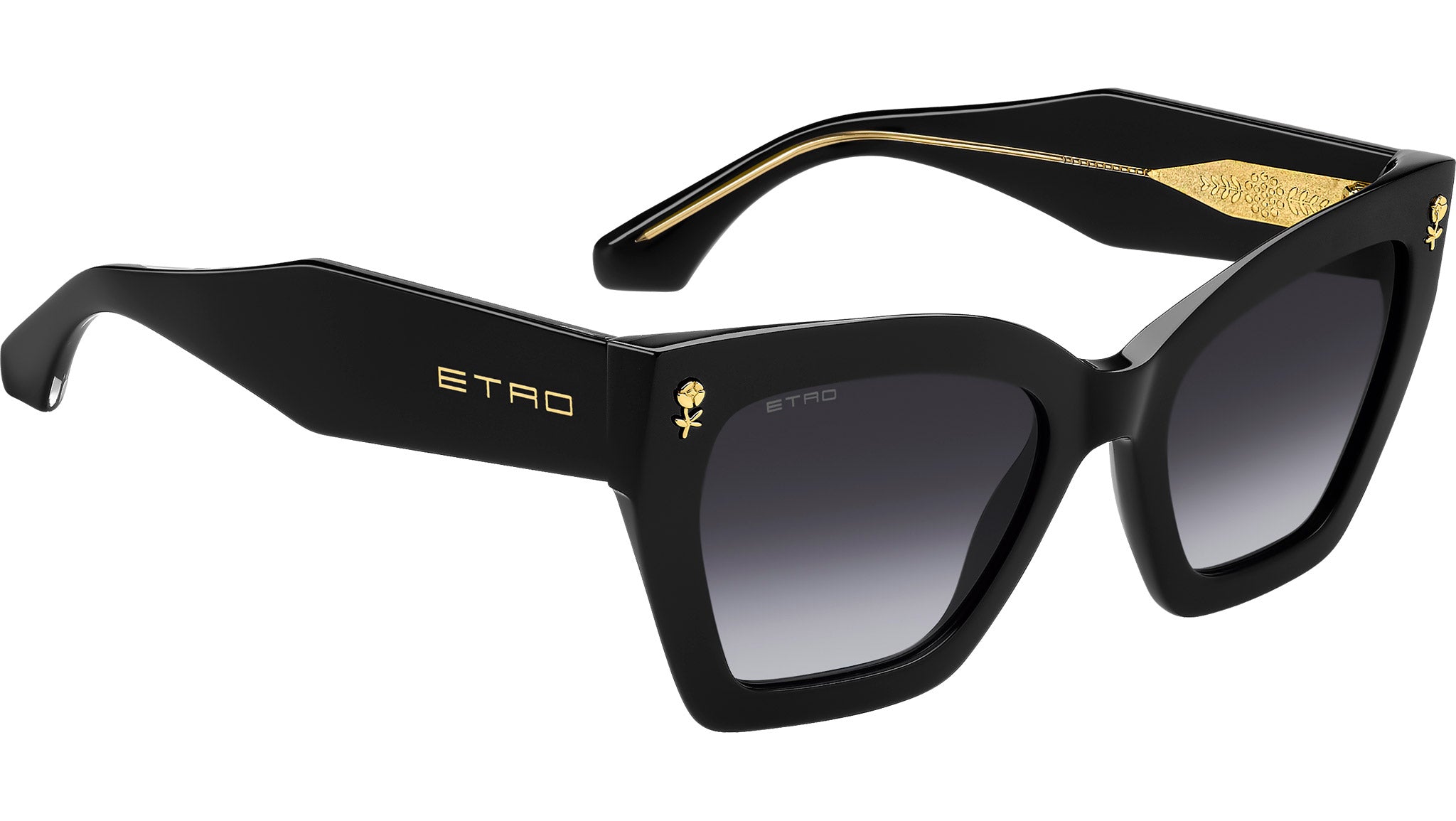 Etro 0090/S 807 9O sunglasses for women, featuring black rectangular acetate frame and dark grey shaded lenses. Brand line: Etromania. Style code: 207784. Color code: 807 9O. Authorized Etro online reseller. Your glasses will include the original case and accessories and are covered by a 12-month global warranty.