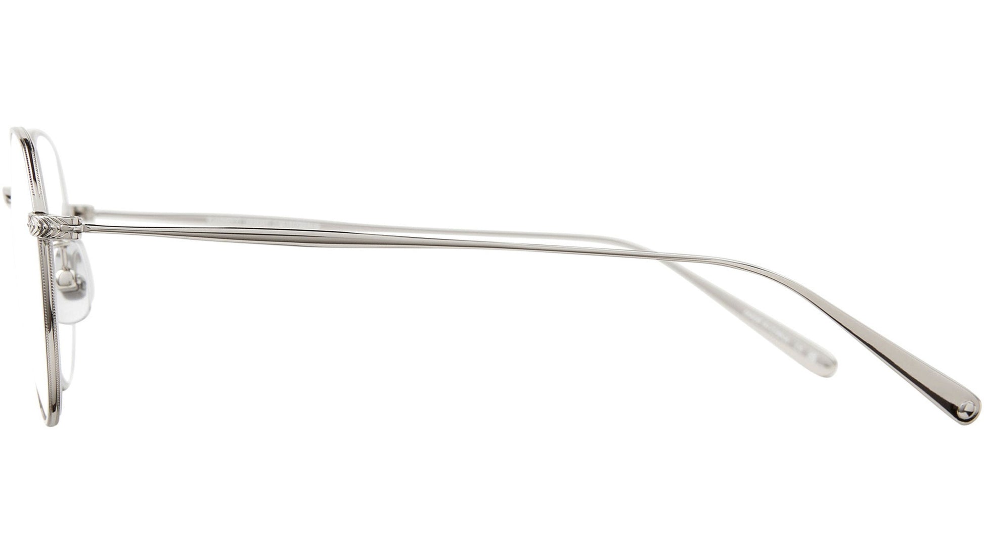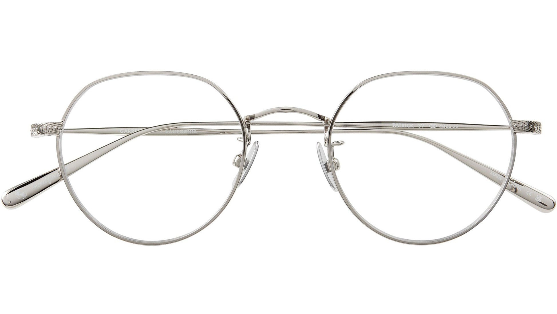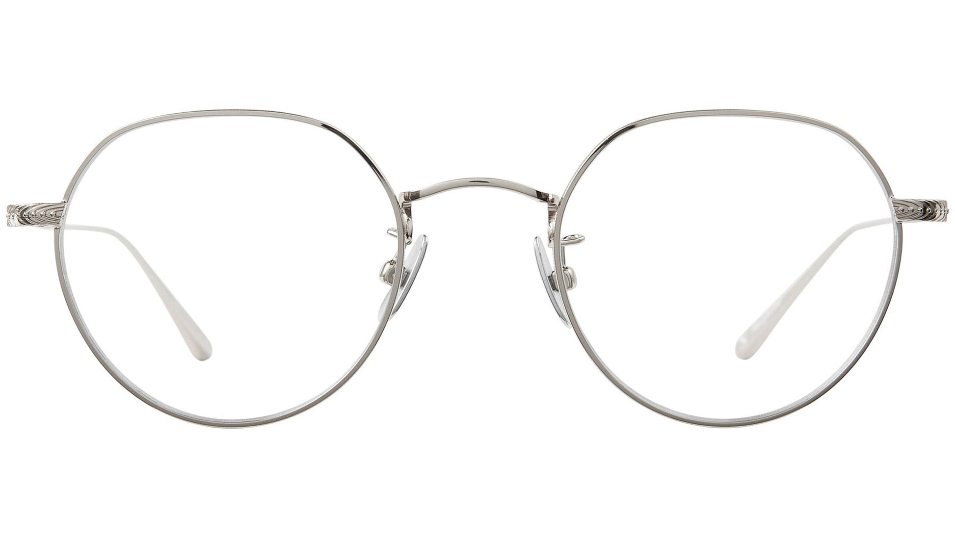 Garrett Leight Patrick glasses featuring silver round metal frame and demo lens lenses. The Patrick features a sleek, flat-topped P3 all-metal frame with refined coin-edge detailing along the eye wire and intricate filigree on the endpieces. Its all-metal temples and screw-in titanium nose pads ensure both durability and comfort. Offered in a range of classic plating colors, this model is designed for unisex appeal. Technical features include hand-finished optical quality CR-39 lenses, Saturn endpiece filigree, 4 base lens with backside anti-reflective coating, and the inclusion of a GLCO soft case and cleaning cloth. Brand line: GLCO. Style code: 3074. Color code: SV. Authorized Garrett Leight online reseller. Your glasses will include the original case and accessories and are covered by a 12-month global warranty.