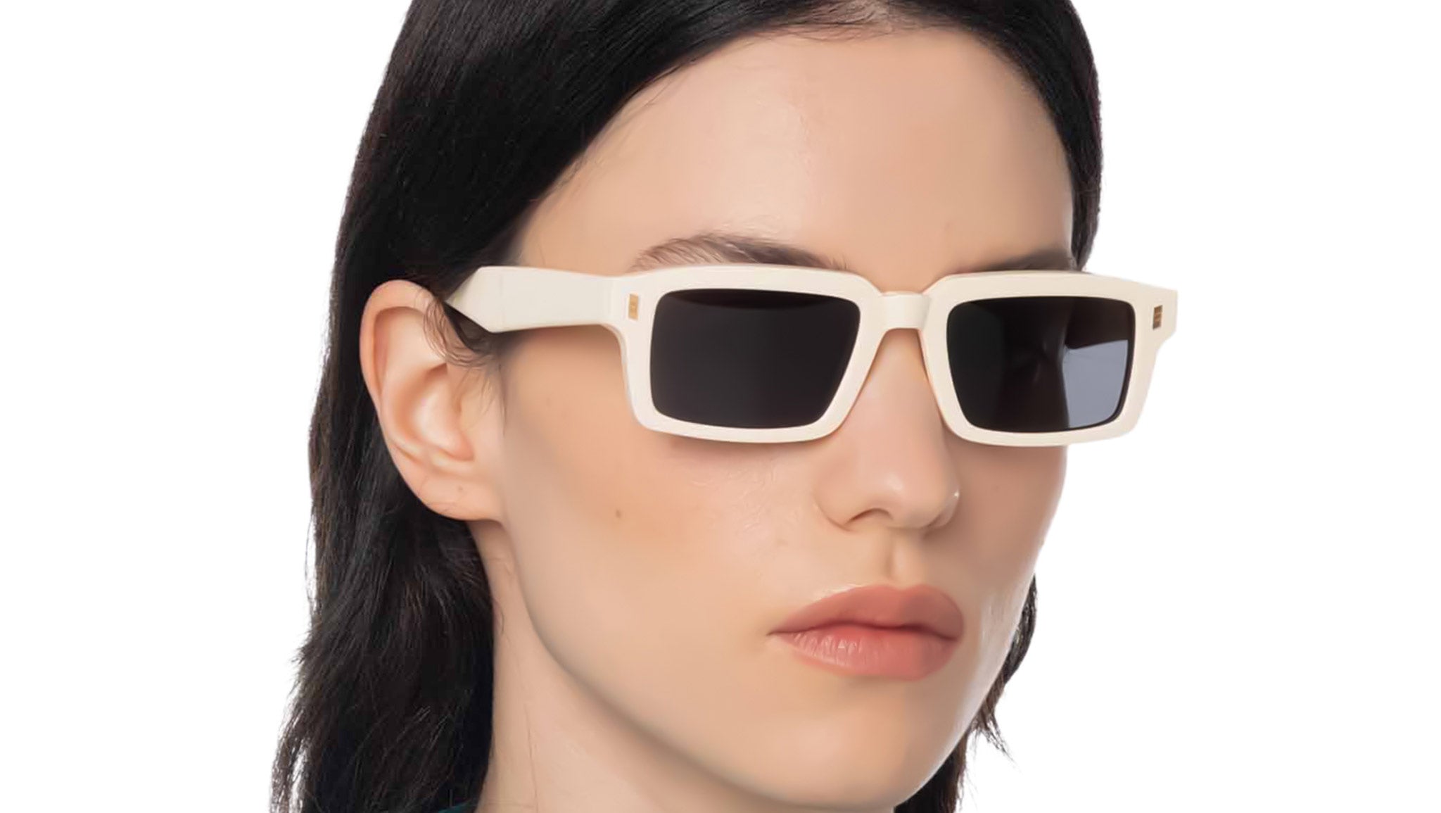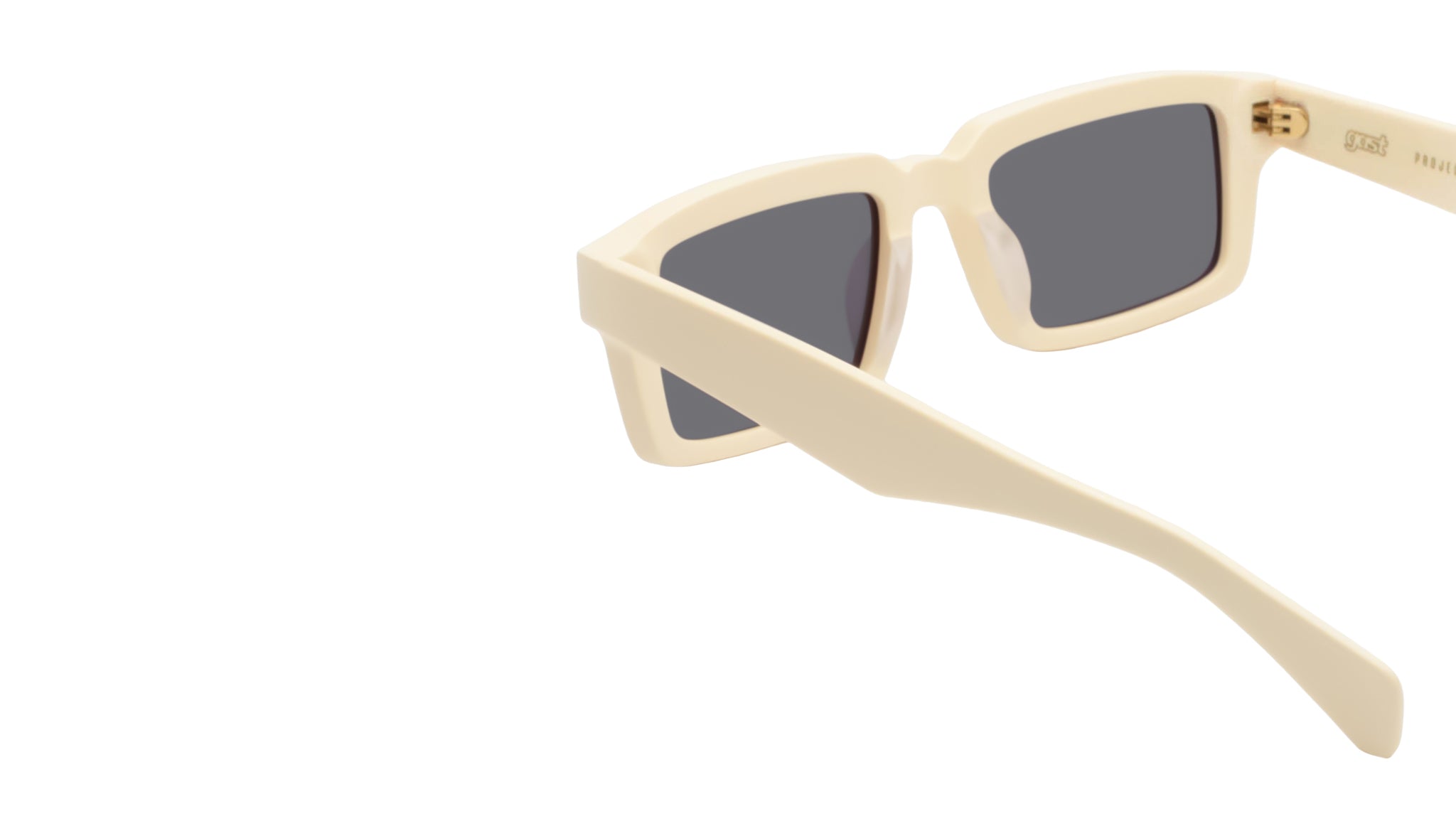 Gast VOV sunglasses featuring eggshell rectangular acetate frame and black lenses. These handmade sunglasses feature an eggshell acetate frame complemented by black semi-flat nylon lenses equipped with an anti-reflective interior coating, offering 100% UVA and UVB protection. They are designed with five barrels metal hinges for enhanced durability and functionality. Style name: VOV. Color code: VV03. Authorized Gast online reseller. Your glasses will include the original case and accessories and are covered by a 12-month global warranty.