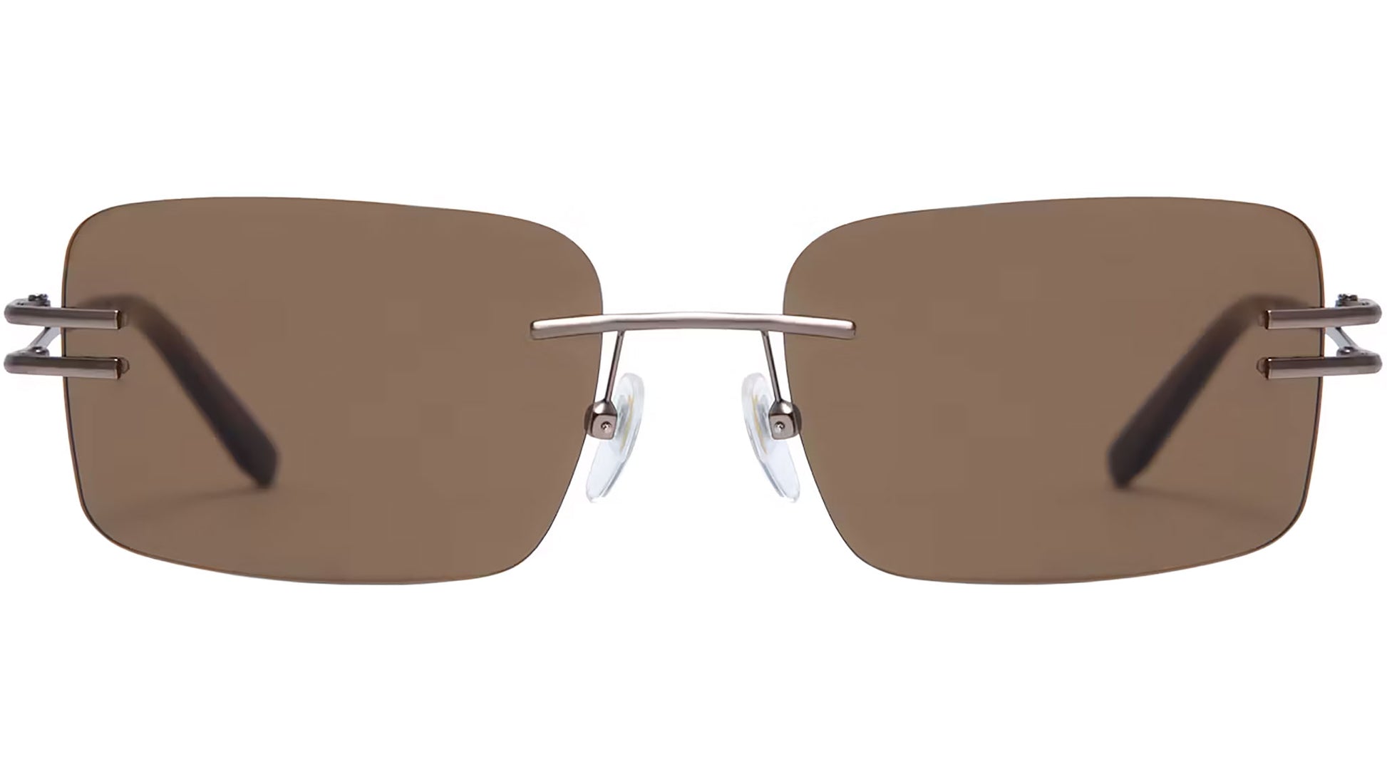 Gigi Studios Eyewar sunglasses model 6862 Ginger color code 3 in brown. A classic rectangle rimless stainless steel glasses with purple lenses. The brand ensures the highest quality through their meticulous selection of materials, partnering with top suppliers from Italy, Germany, and Japan. Gigi Studios provides an exceptional visual experience with CR-39 lenses that are comfortable and secure, effectively absorbing UVA and UVB rays.