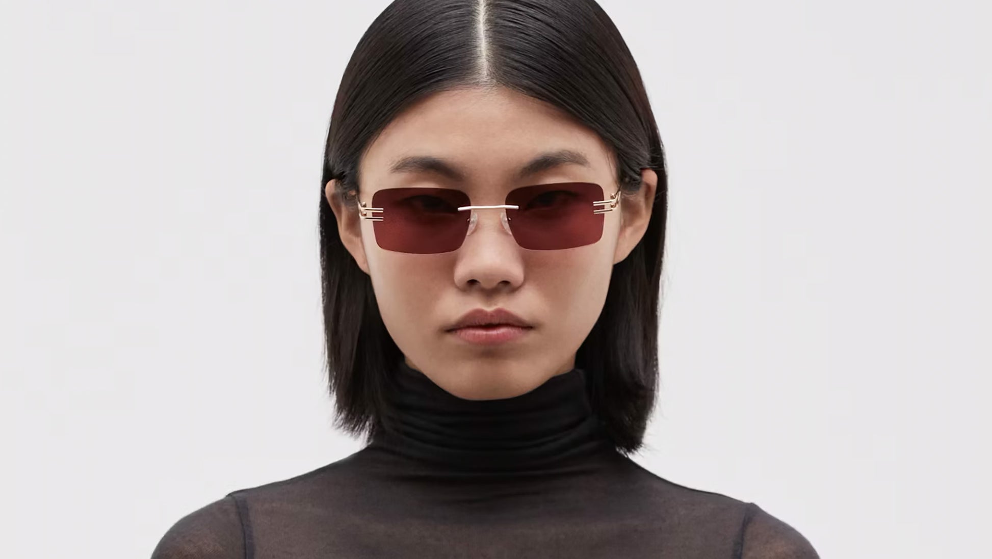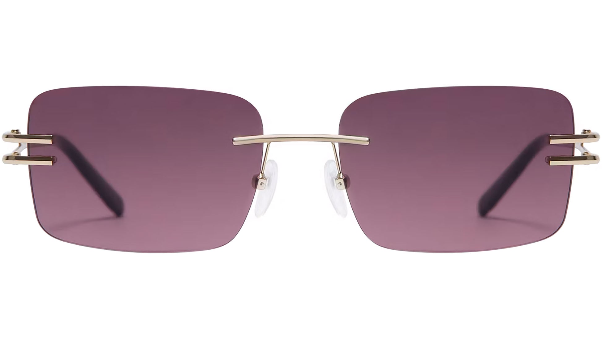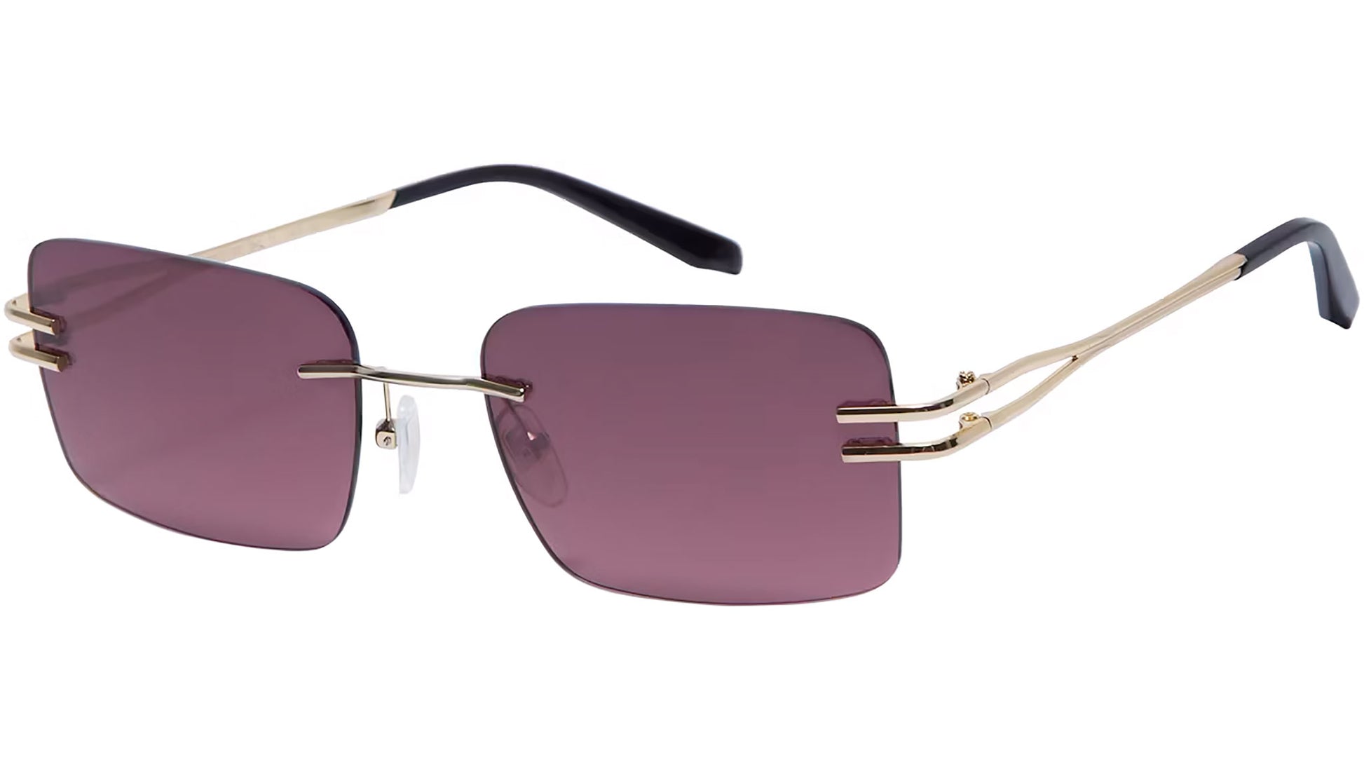 Gigi Studios Eyewar sunglasses model 6862 Ginger color code 6 in gold. A classic rectangle rimless stainless steel glasses with purple lenses. The brand ensures the highest quality through their meticulous selection of materials, partnering with top suppliers from Italy, Germany, and Japan. Gigi Studios provides an exceptional visual experience with CR-39 lenses that are comfortable and secure, effectively absorbing UVA and UVB rays.
