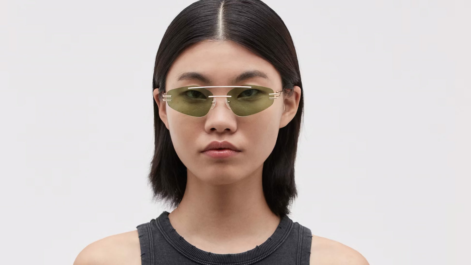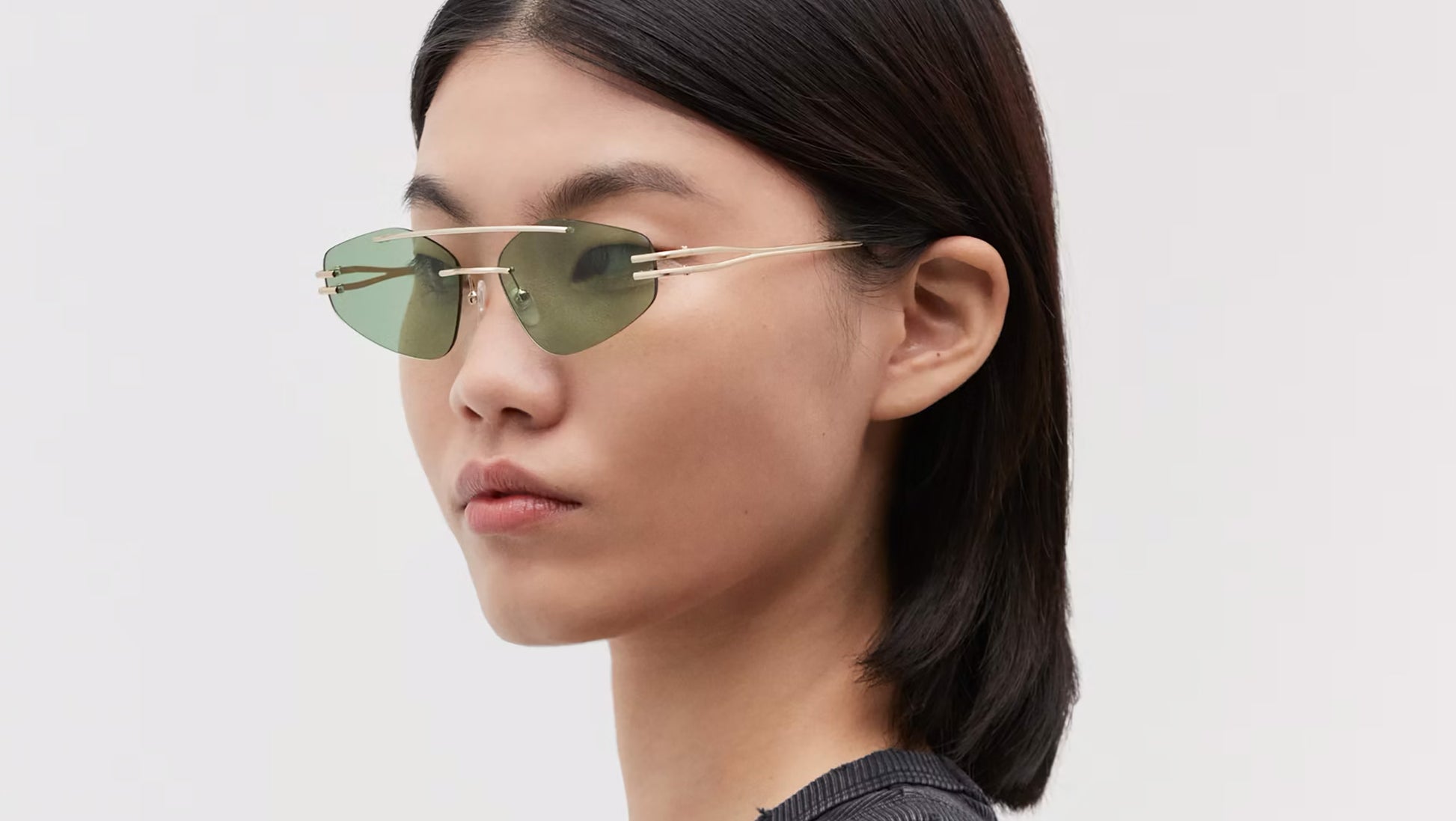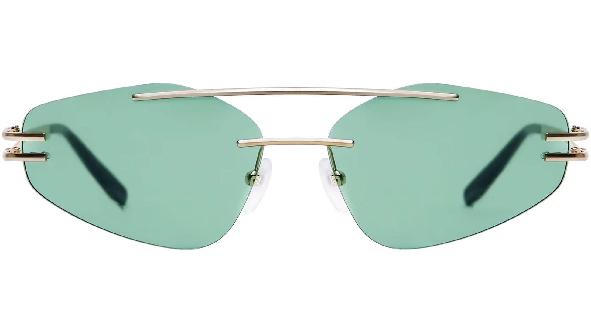 Gigi Studios Eyewar sunglasses model 6860 Nona color code 7 in gold. A classic geometric rimless stainless steel glasses with green lenses. The brand ensures the highest quality through their meticulous selection of materials, partnering with top suppliers from Italy, Germany, and Japan. Gigi Studios provides an exceptional visual experience with CR-39 lenses that are comfortable and secure, effectively absorbing UVA and UVB rays.