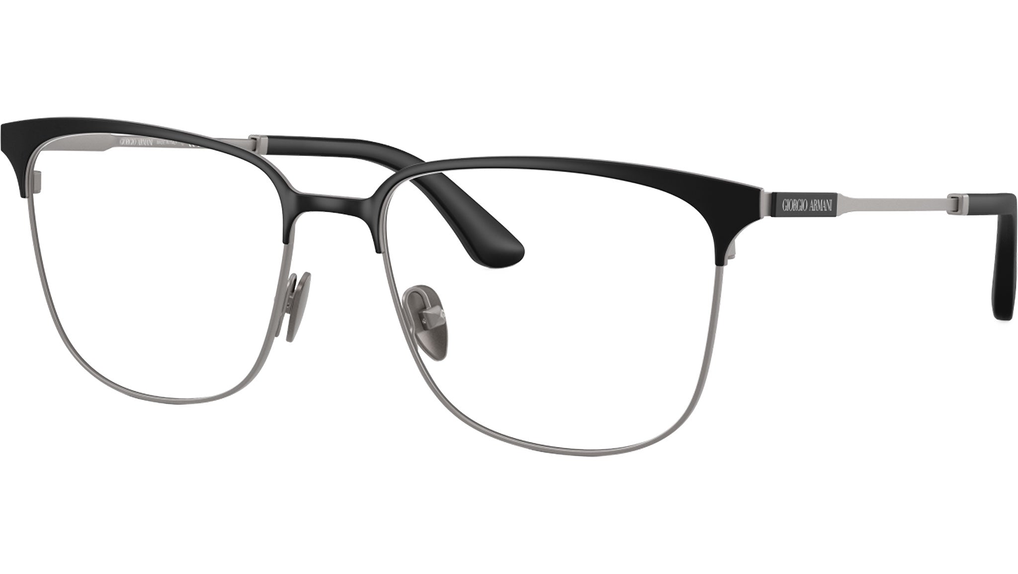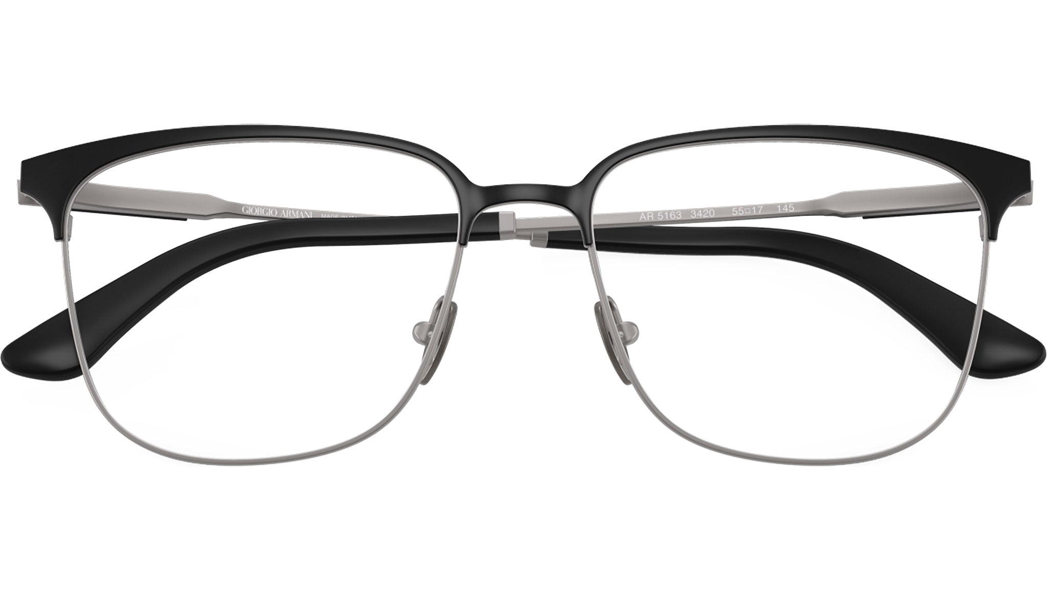 Giorgio Armani AR 5163 3420 glasses, featuring matte black d-frame metal frame and demo lenses. Adjustable nosepads. Brand line: Armani Code. Style code: 0AR5163. Color code: 3420. Authorized Giorgio Armani online reseller. Your glasses will include the original case and accessories and are covered by a 12-month global warranty.