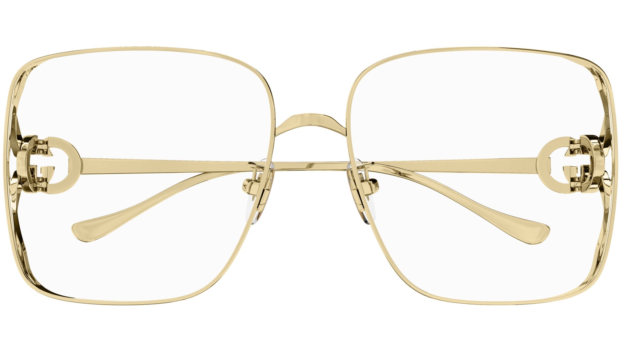 Gucci Logo optical collection model GG1321O 002 featuring shiny endura gold frame and gold temple.