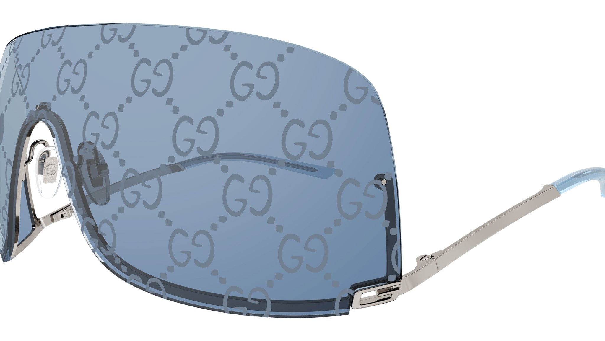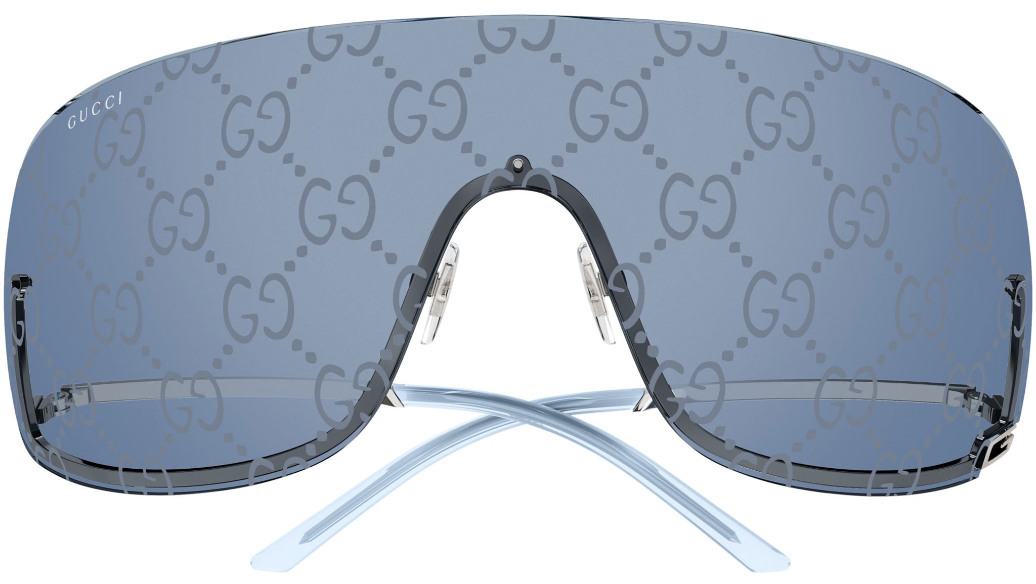 Gucci Fashion sunglasses model GG1560S shield metal frame color code 003 shiny transparent light grey with grey temple and solid blue + ml silver Guccissima pattern lens.