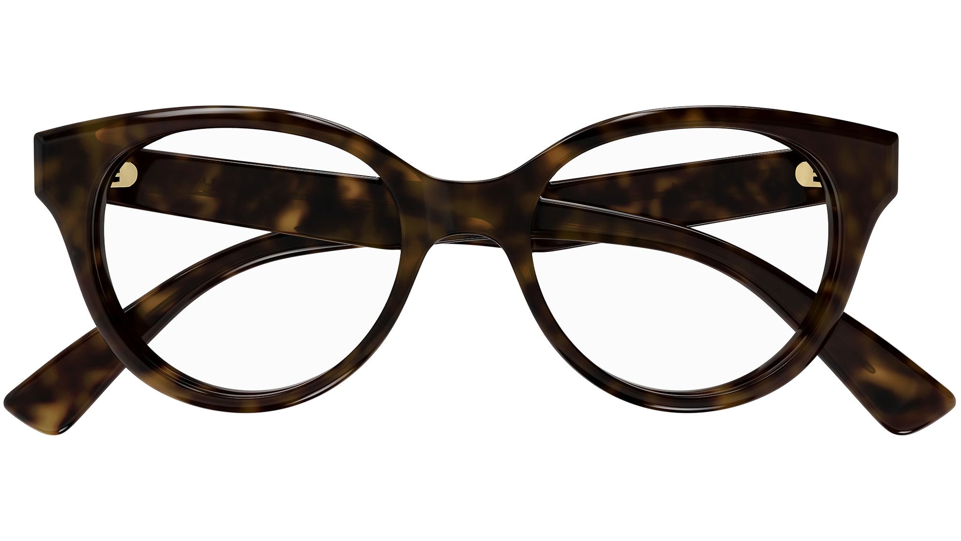 Gucci Lettering eyewear model GG1590O panthos recycled acetate glasses color code 002 shiny dark havana with havana temple and demo lens.