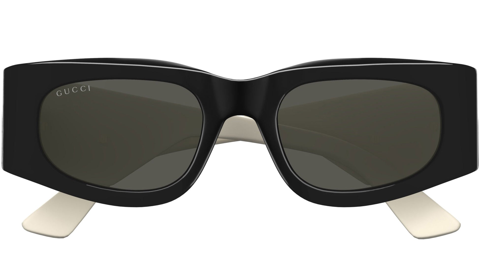 Gucci sunglasses model GG1664S GG Logo line rectangle recycled acetate frame color code 001 shiny black with ivory temple and solid grey lenses. Authorized Gucci online reseller. Your glasses will come with the original case and accessories and will be covered by a 12-month global warranty.