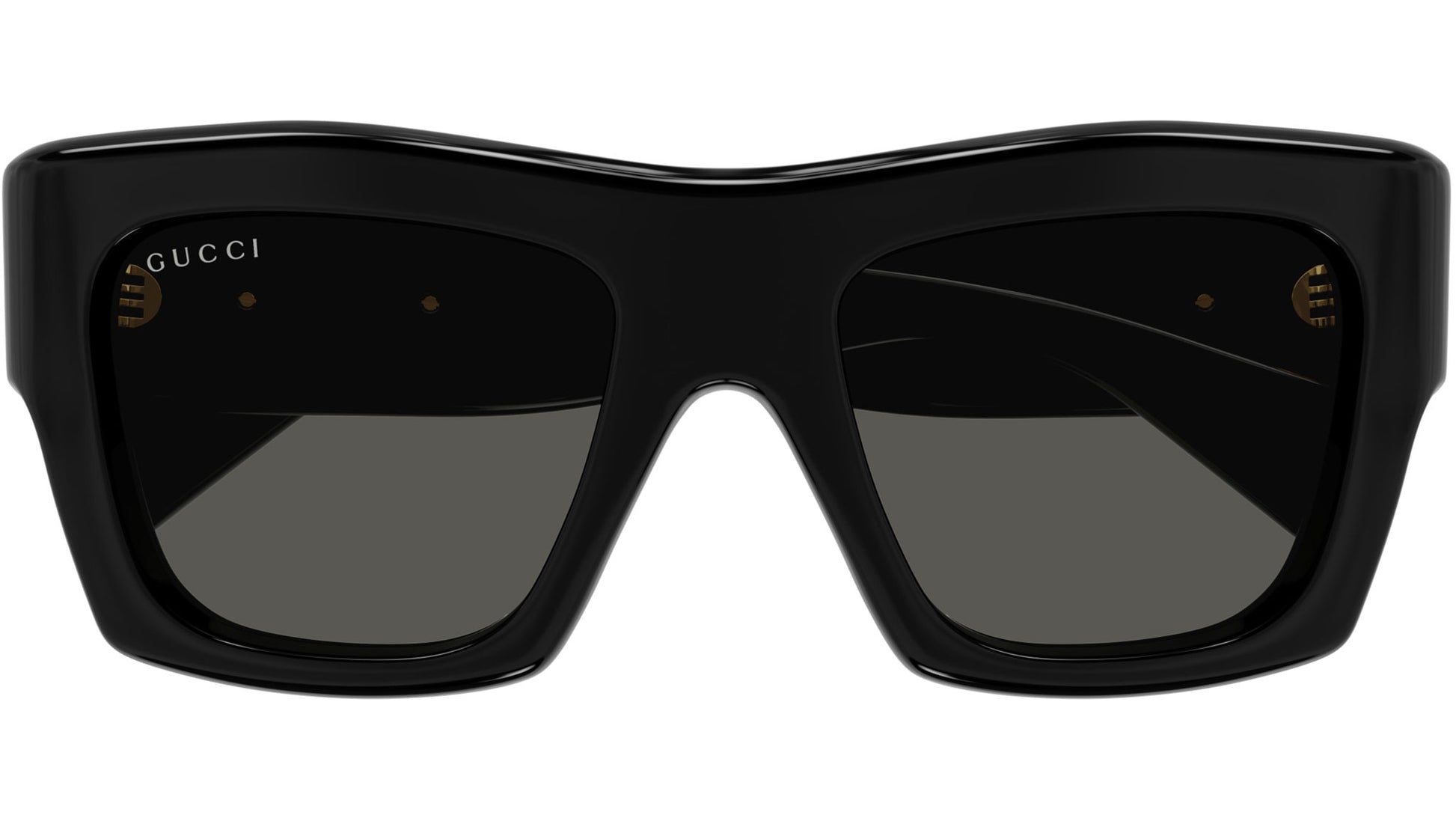 Gucci sunglasses model GG1772S rectangle recycled acetate frame color code 001 shiny black with black temple and solid grey lens.