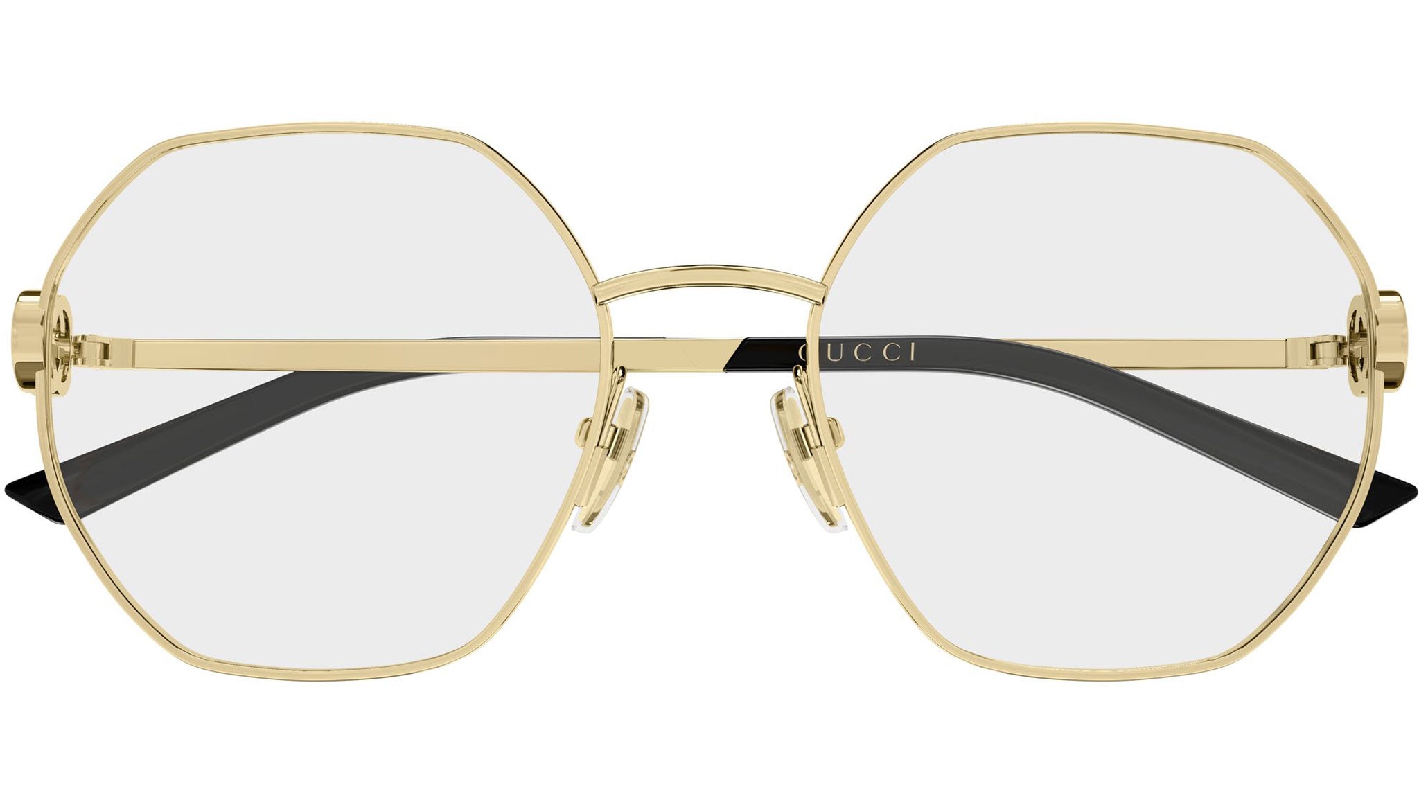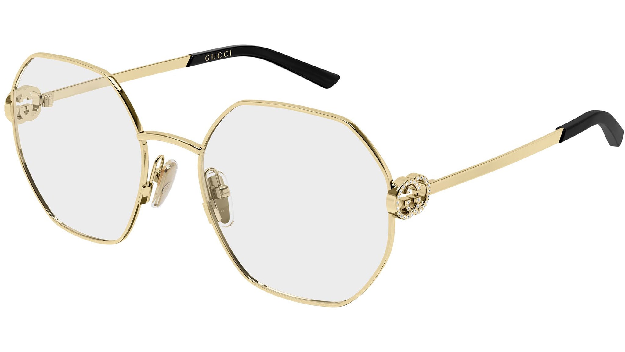 Gucci GG2048O glasses for women, featuring shiny endura gold geometric metal frame and demo lenses. Brand line: Emblem. Style code: GG2048O. Color code: size 56: 006. Size 54: 001. Made in Italy. Authorized Gucci online reseller. Your glasses will include the original case and accessories and are covered by a 12-month global warranty.